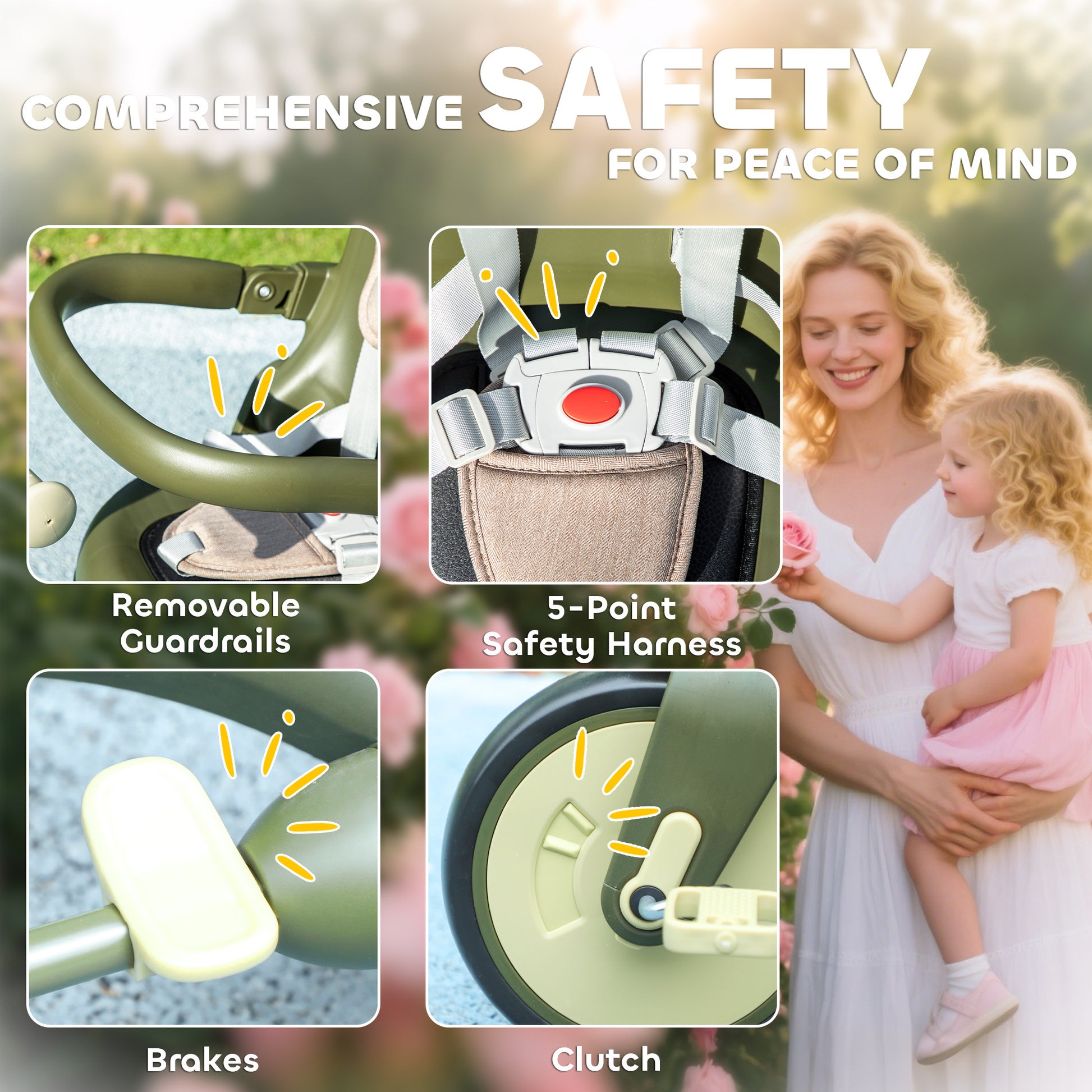 AIYAPLAY 5 in 1 Kids Trike with Adjustable Backrest, Toddler Tricycle with Push Handlebar, Adjustable Backrest, Dark Green
