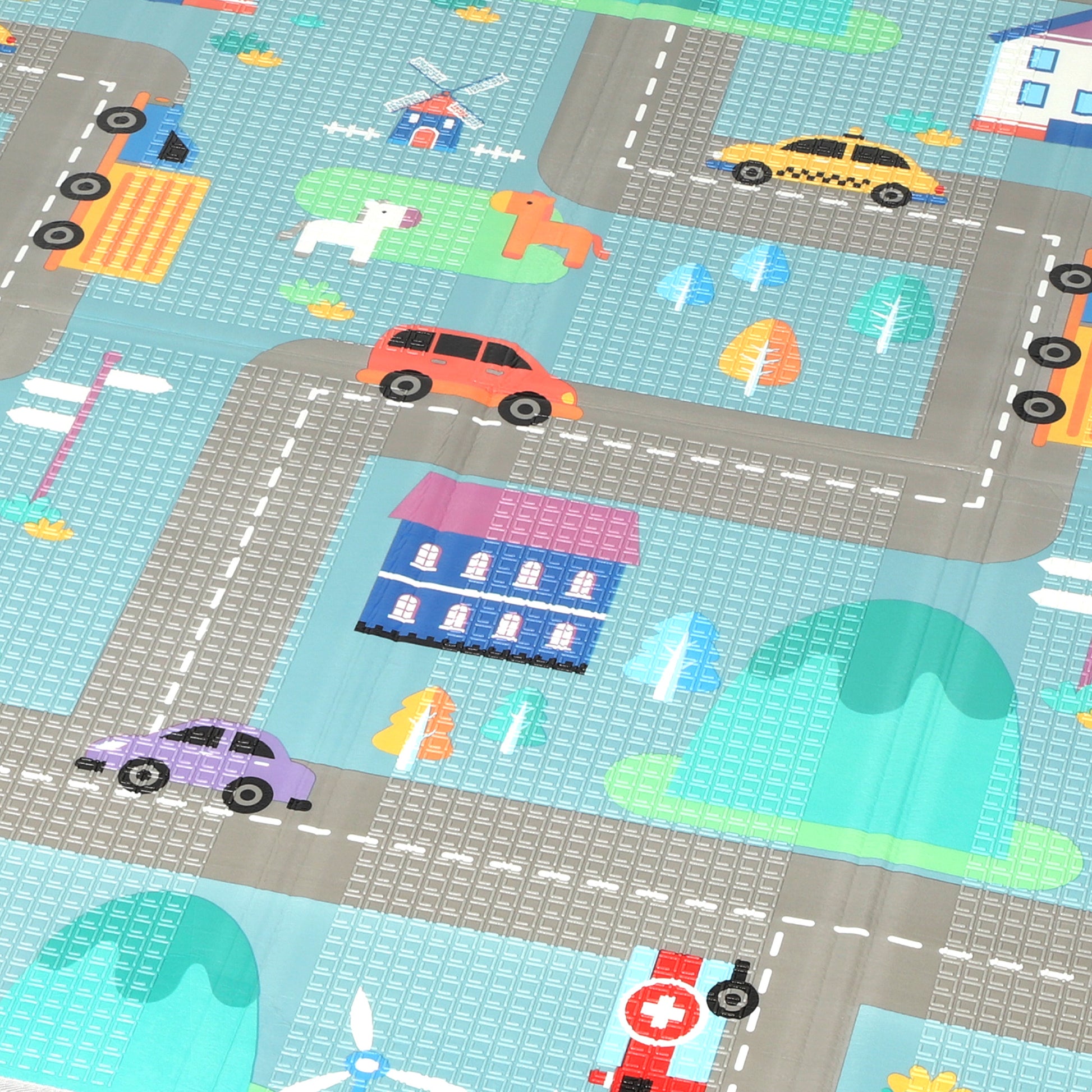 The AIYAPLAY foldable baby mat provides a comfy, secure place for little ones to play and explore. One side showcases a playful traffic road design, great for mini car adventures, while the other side features vibrant rocking horses. Made from gentle, soft foam, it helps cushion first steps and tummy time. This lightweight, foldable mat is easily stored and suitable for family outings, providing safe and fun playtime wherever you go.