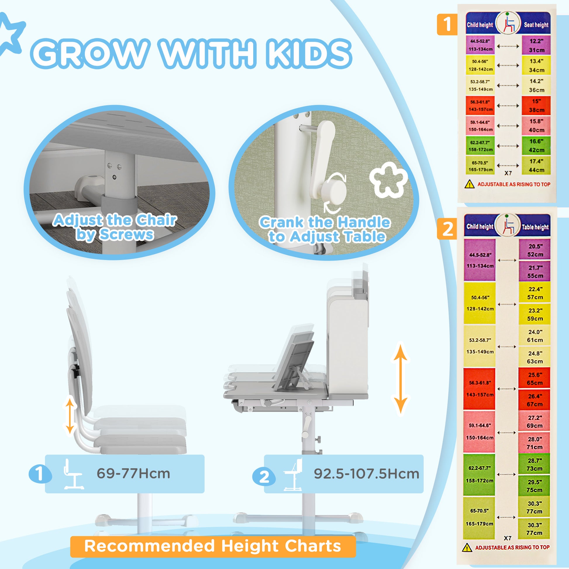 AIYAPLAY Height Adjustable Kids Desk and Chair Set, Children School Study Desk with Tiltable Desktop, Reading Rack, Grey