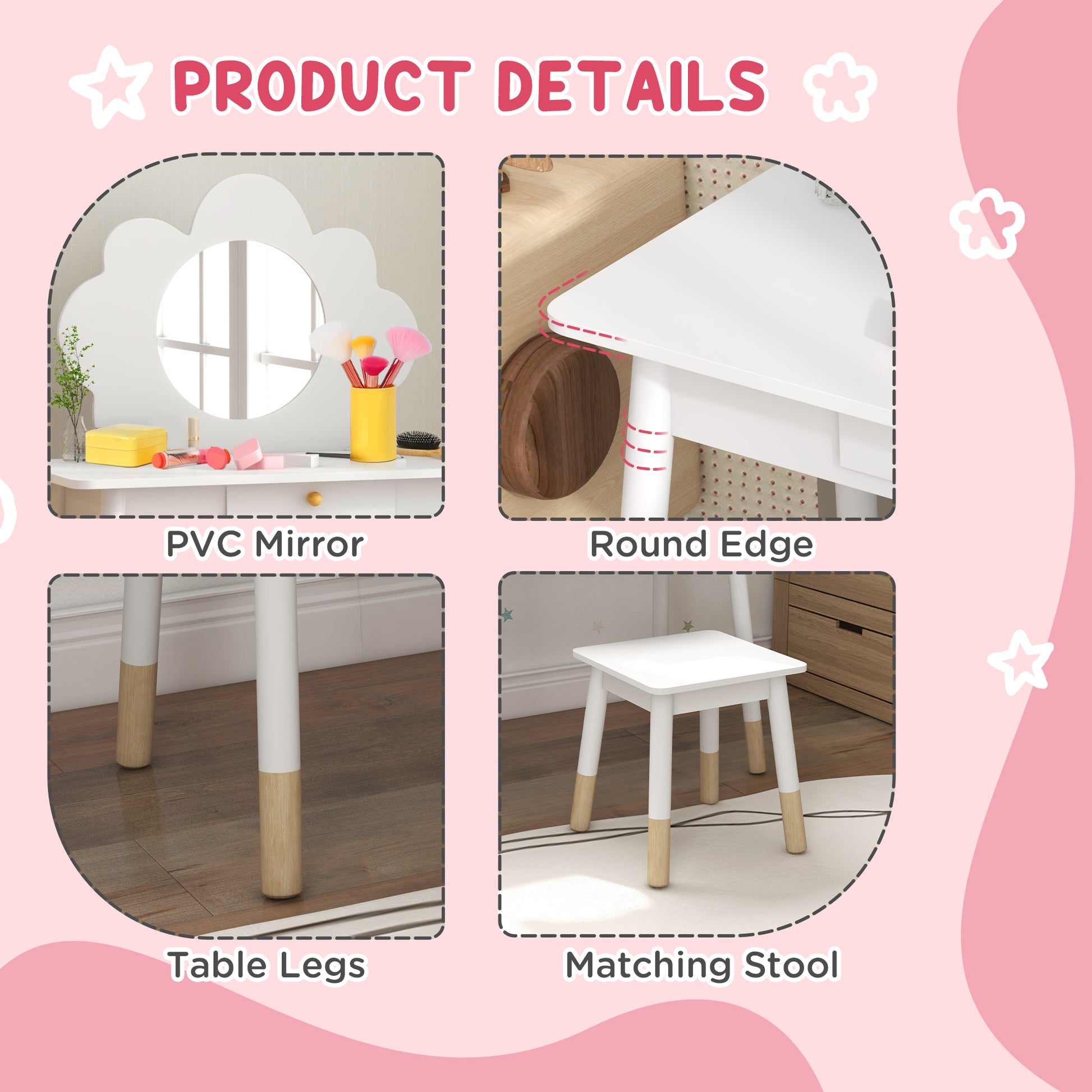 AIYAPLAY Kids Dressing Table with Mirror, Stool, Drawer, Cloud Design, White