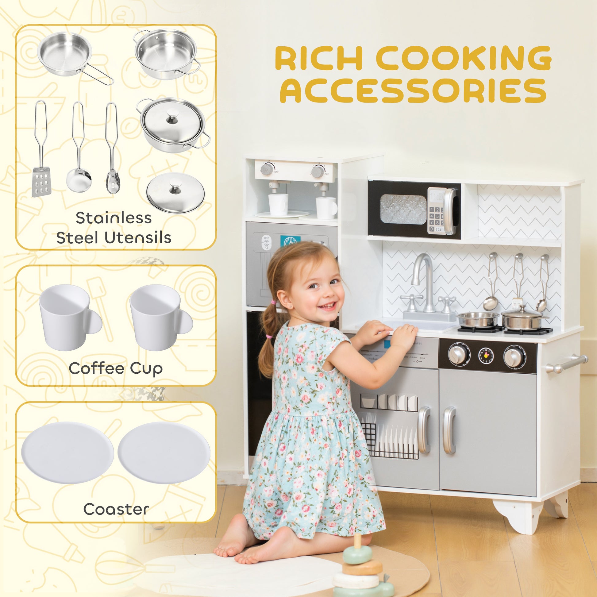 AIYAPLAY Kids Play Kitchen with Sound, Ice/Coffee Maker, Utensils, Microwave, Stainless Steel Utensils, for 3-6 Years