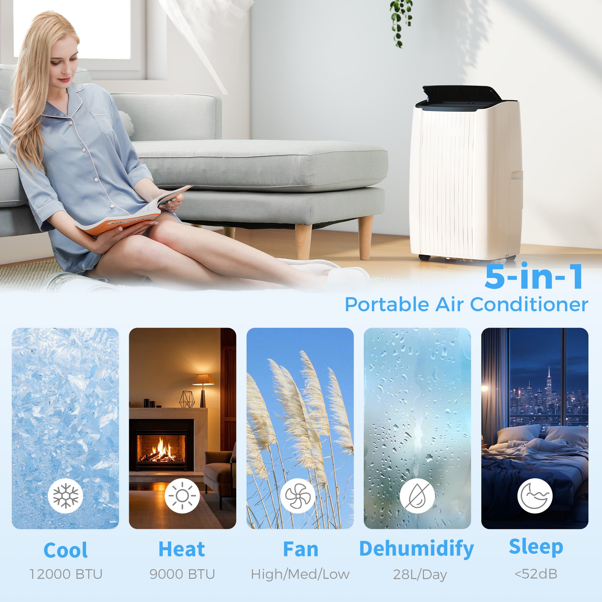 Stay comfortable all year with this portable air conditioner! Boasting 12000 BTU cooling for summer and 9000 BTU heating for winter, it's perfect for rooms 18-35 m². With five-in-one functionality, including dehumidifying and a quiet sleep mode, it adapts to your every need. Control it from anywhere via WiFi, or Google Assistant. Smart, versatile, and ready to transform your space!