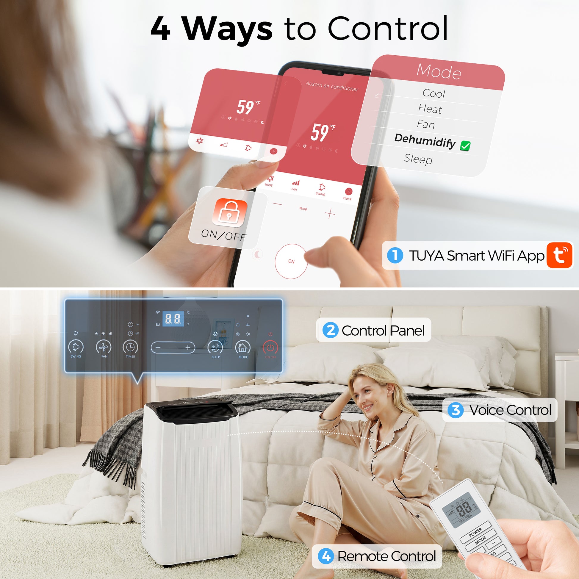 - Five-in-one functionality suits cooling, heating, dehumidifying, fan, and sleep