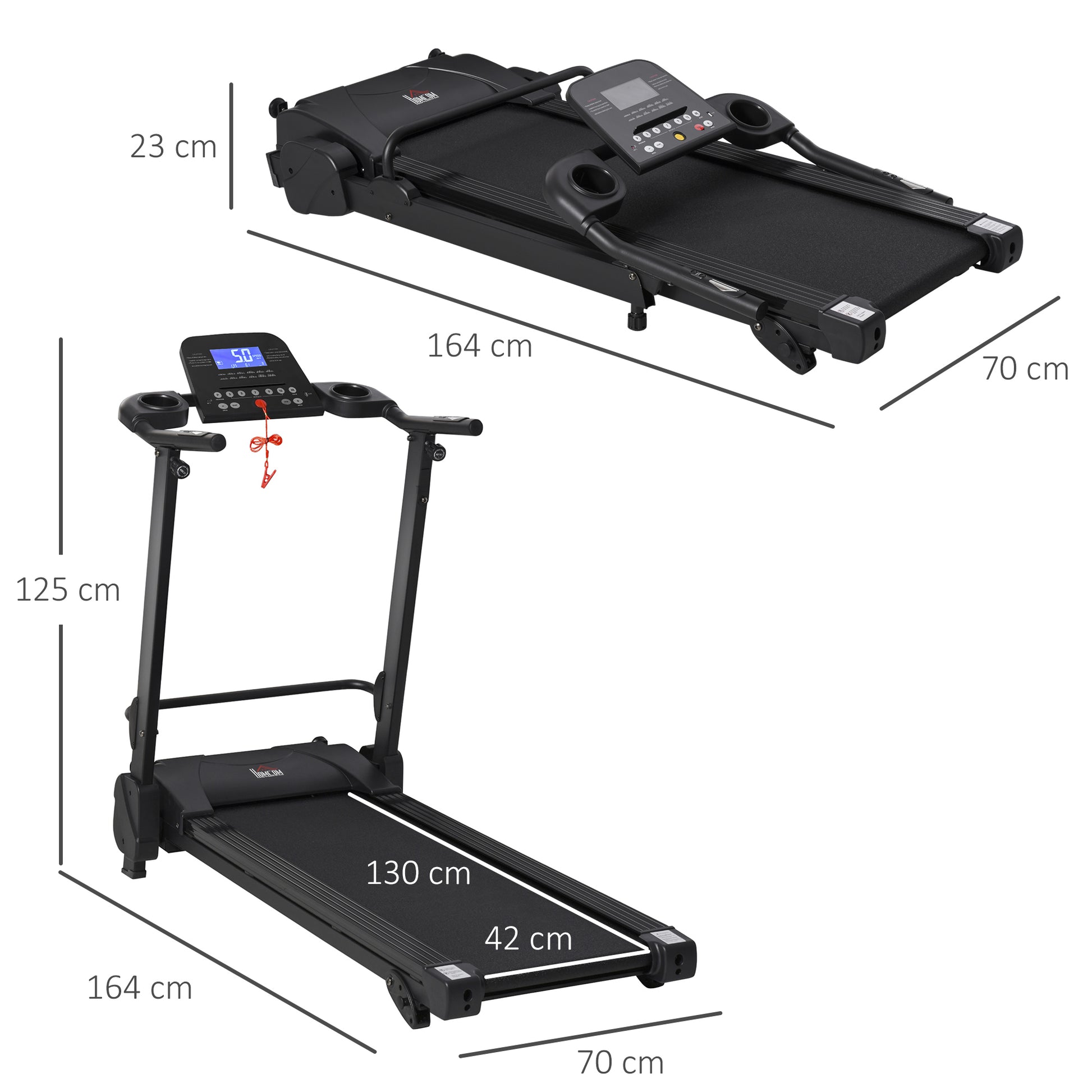Fitness, whenever and wherever you want with this foldable treadmill from HOMCOM. It reaches up to 14km/h - ideal for fitness fanatics beginner or advanced. There are five different set programmes in the walking machine, so you can set to a workout which will push you further differently than your routine. The LCD monitor on the front keeps track of the time and other stats. Walking treadmill is equipped with two wheels to move around easily, it's finished with an emergency button for safety.