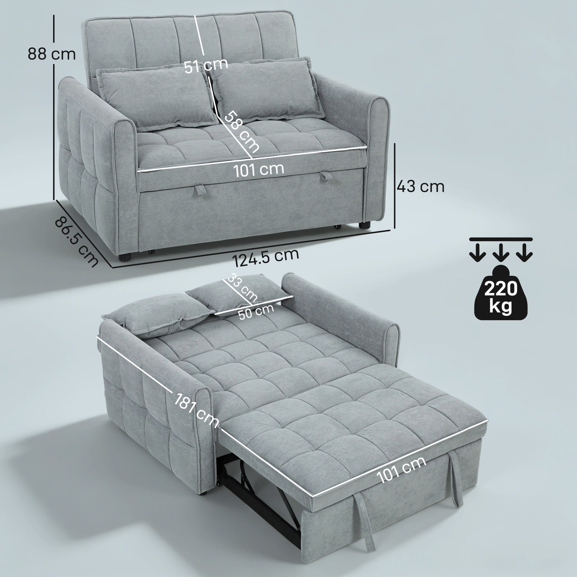 HOMCOM 2 Seater Sofa Bed, 3-in-1 Convertible Sleeper Sofa with Click-clack Adjustable Backrest and 2 Pillows, Grey