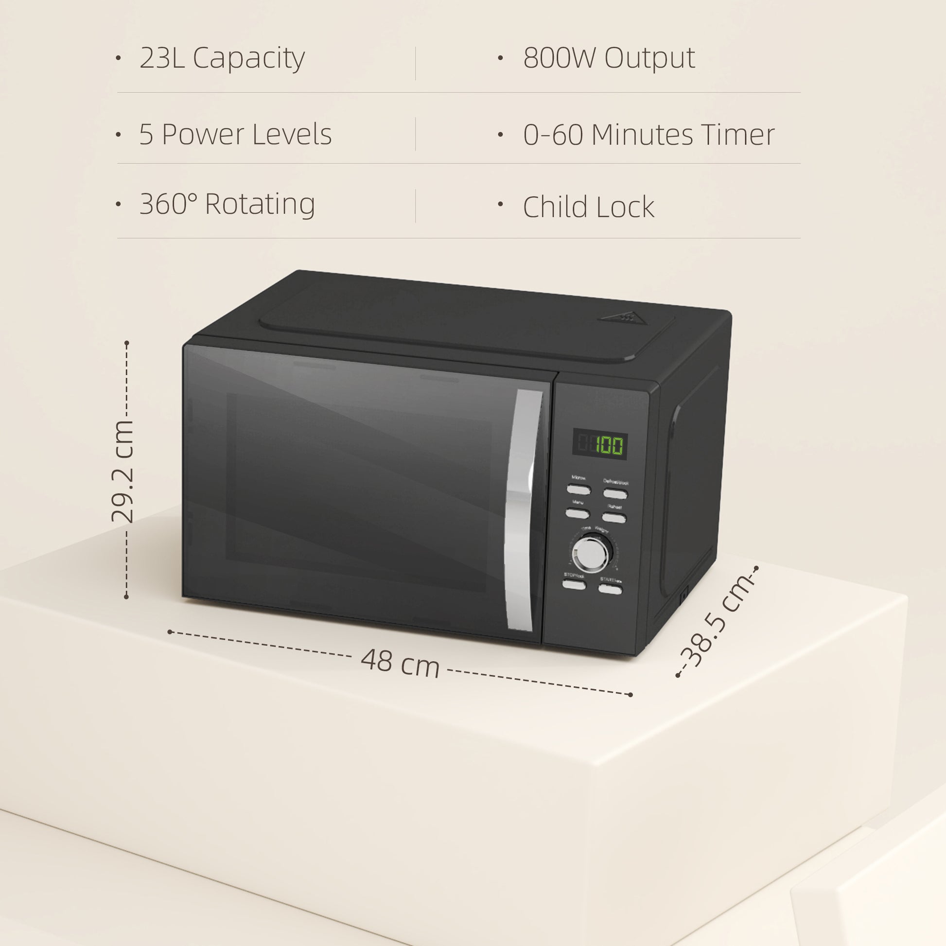 - Five power levels, 0-60 minutes timer for precision cooking control