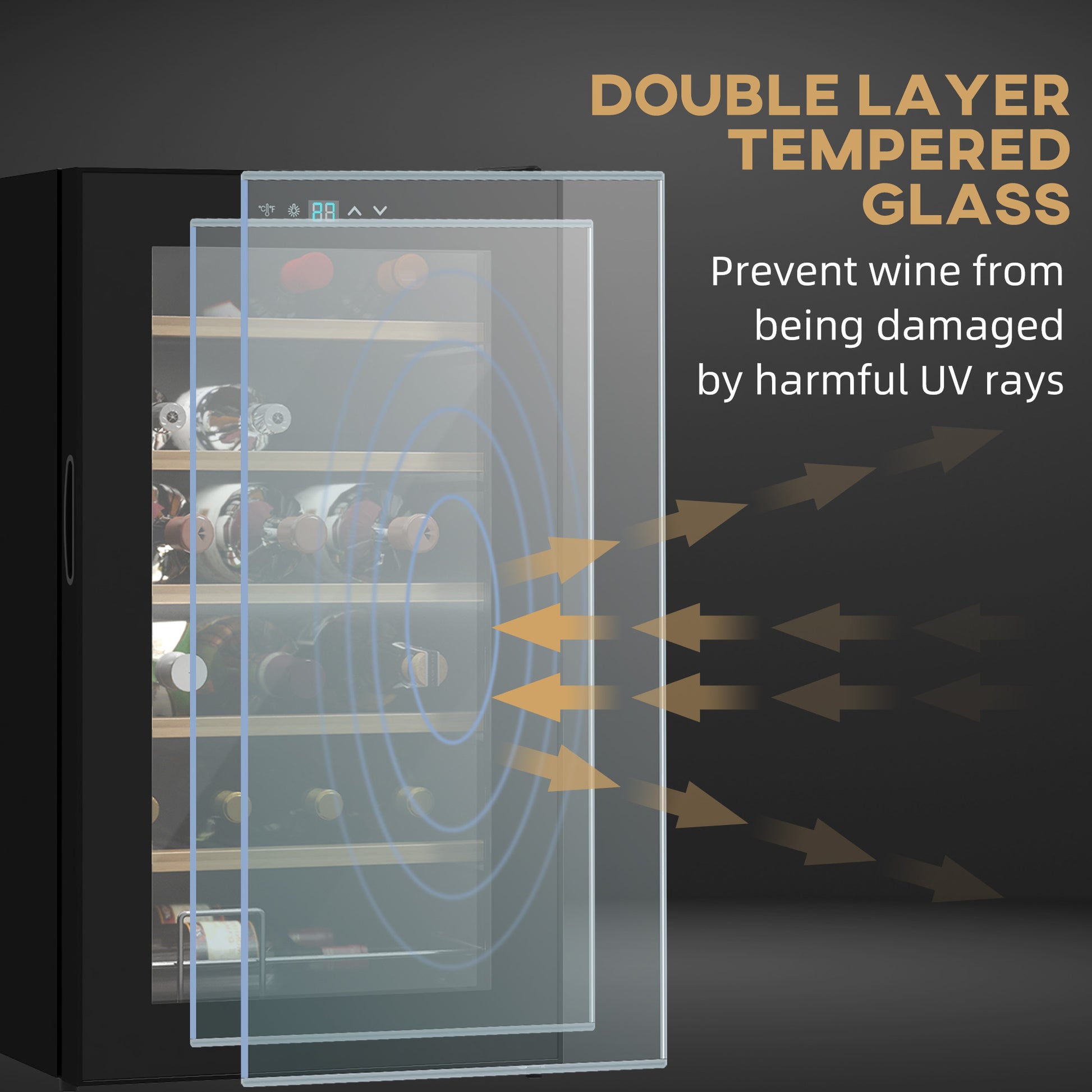 Chill your favourite tipples to perfection with the HOMCOM Wine Fridge with glass door. Precision temperature control from 5-20℃ lets you cater to whites, prosecco. A simple touch control and LED display ensure hassle-free operation, while the large capacity holds up to 24 bottles on stylish wood finish racks. Great for any spot from home bars to kitchens!