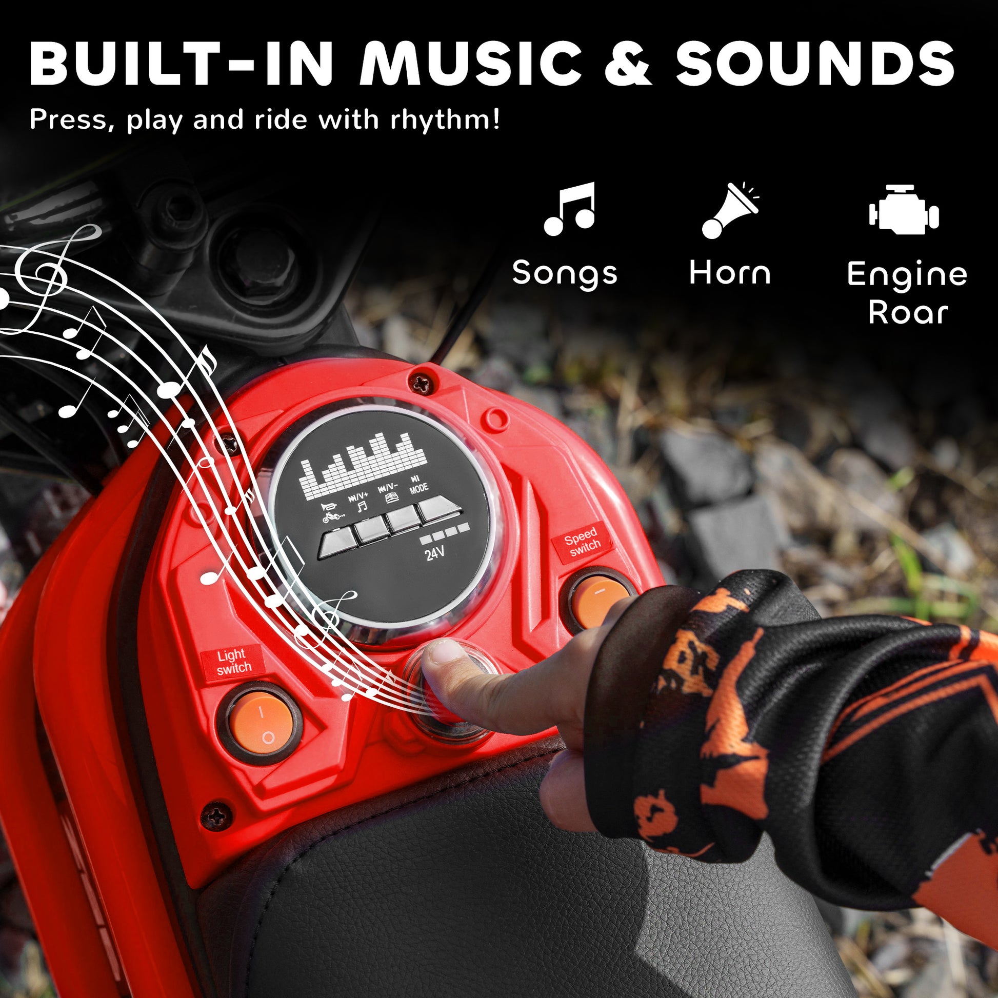HOMCOM 24V Electric Motorbike with Twist Grip Throttle, Music, Horn, 12" Pneumatic Tyres, 16km/h Max Speed - Red