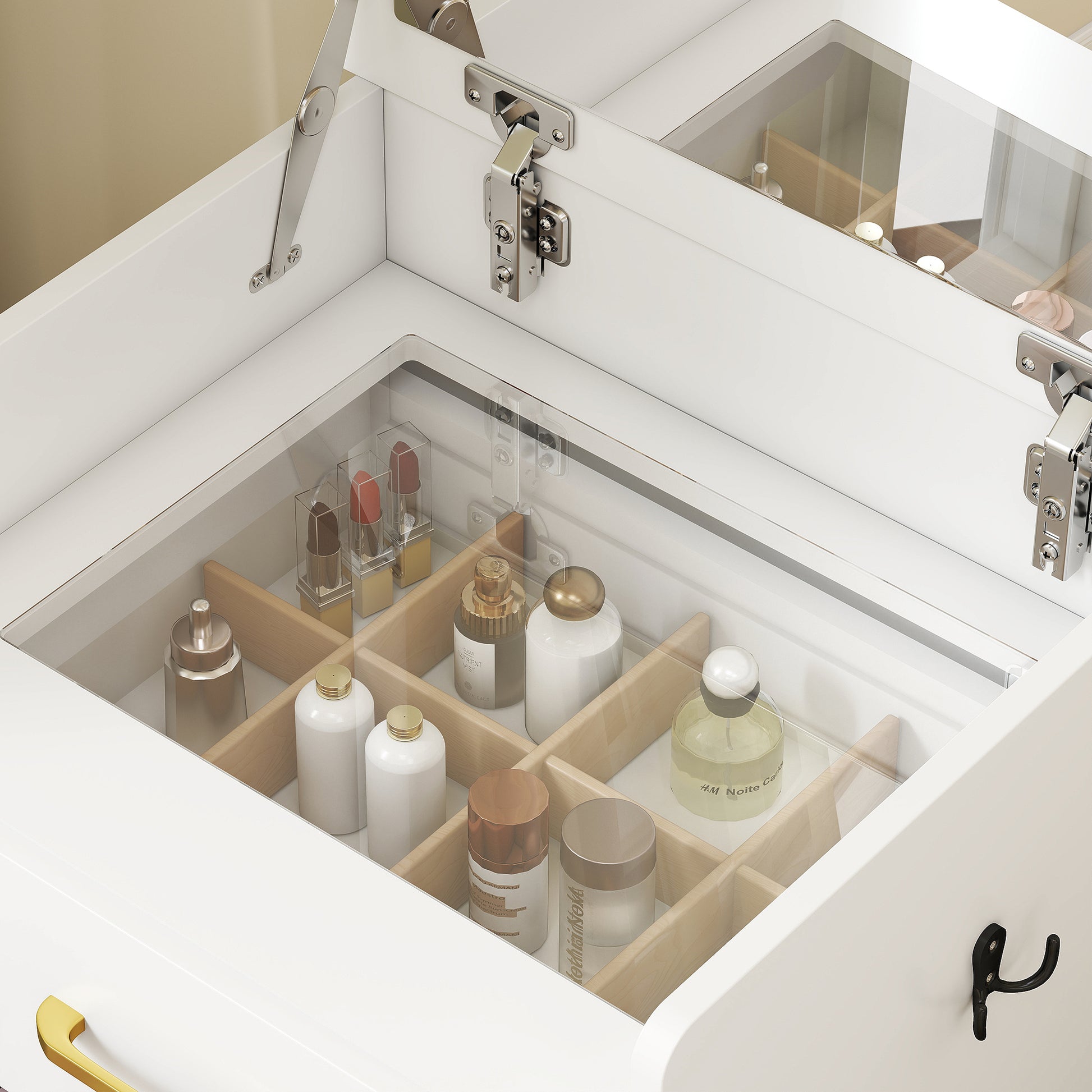 - Glass tabletop helps quickly spot cosmetics or jewellery