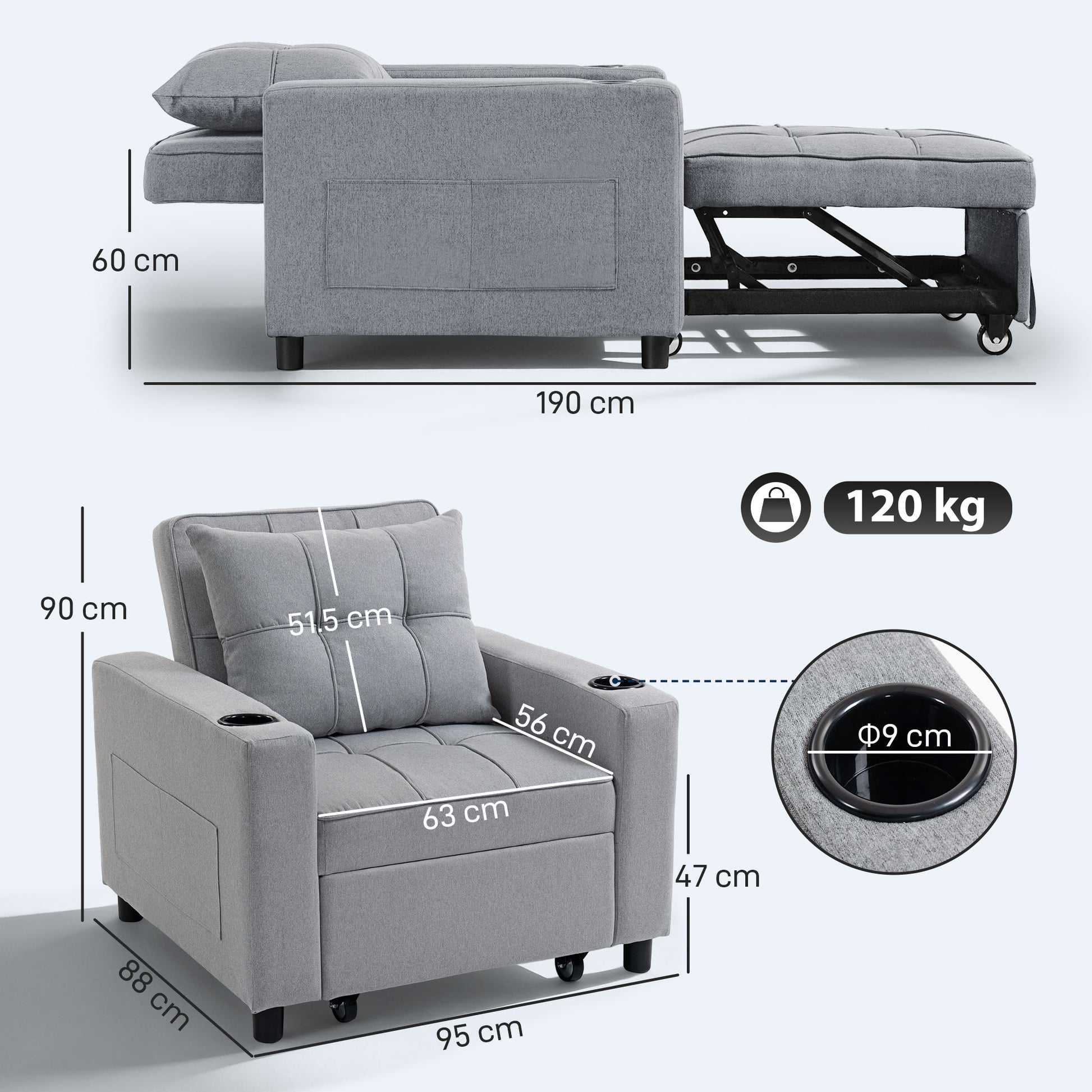 HOMCOM 3-in-1 Single Sofa Bed, Convertible Sleeper Chair Bed - Light Grey