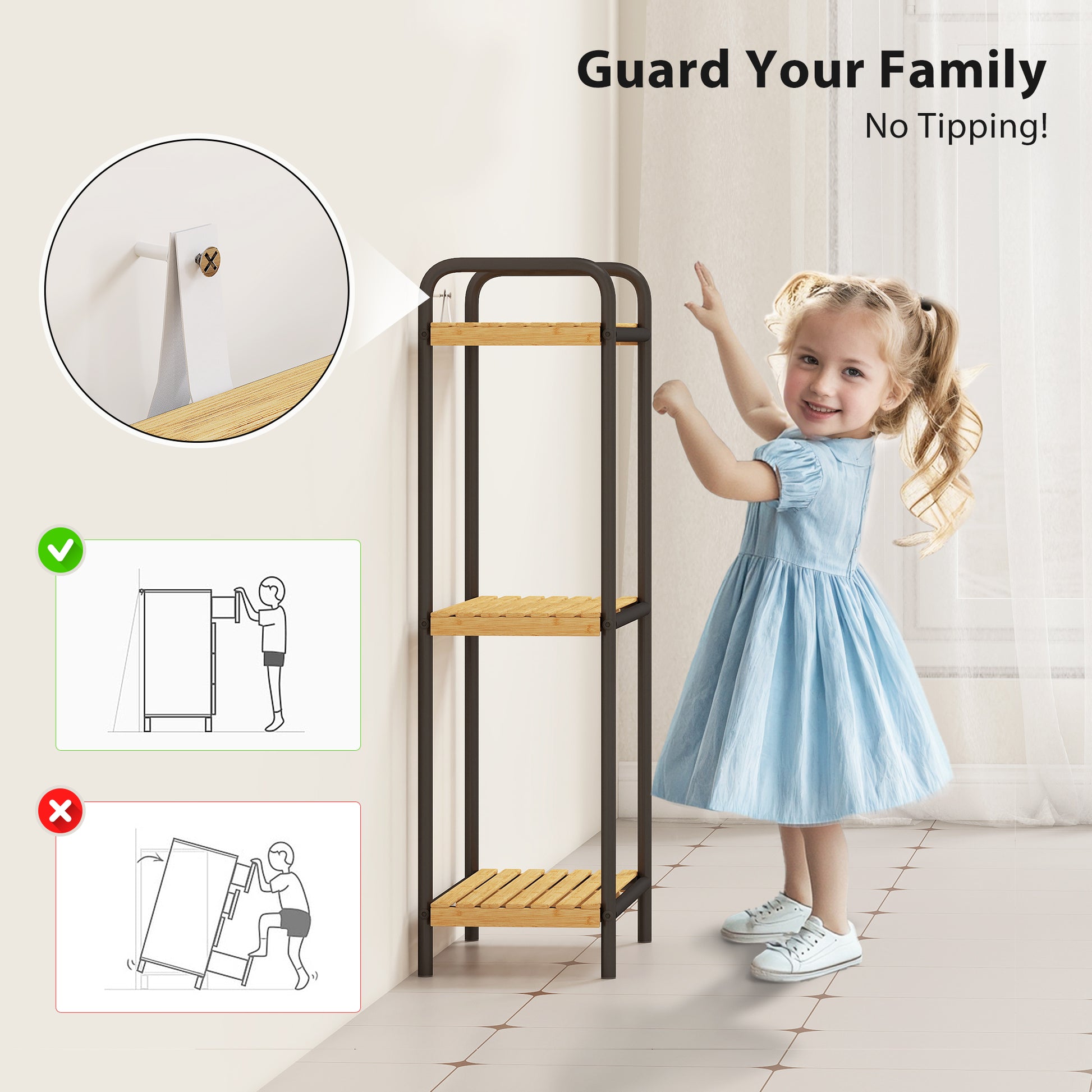 Transform your bathroom into a haven of safety and style with the HOMCOM freestanding bathroom shelf unit. Designed with anti-tip devices and a robust steel frame, it ensures peace of mind for families with little ones. Crafted from bamboo and steel with fresh varnish, it blends durability with natural aesthetics. Its three-tier slatted shelves offer lots of space to keep essentials organised and elevate your living experience.