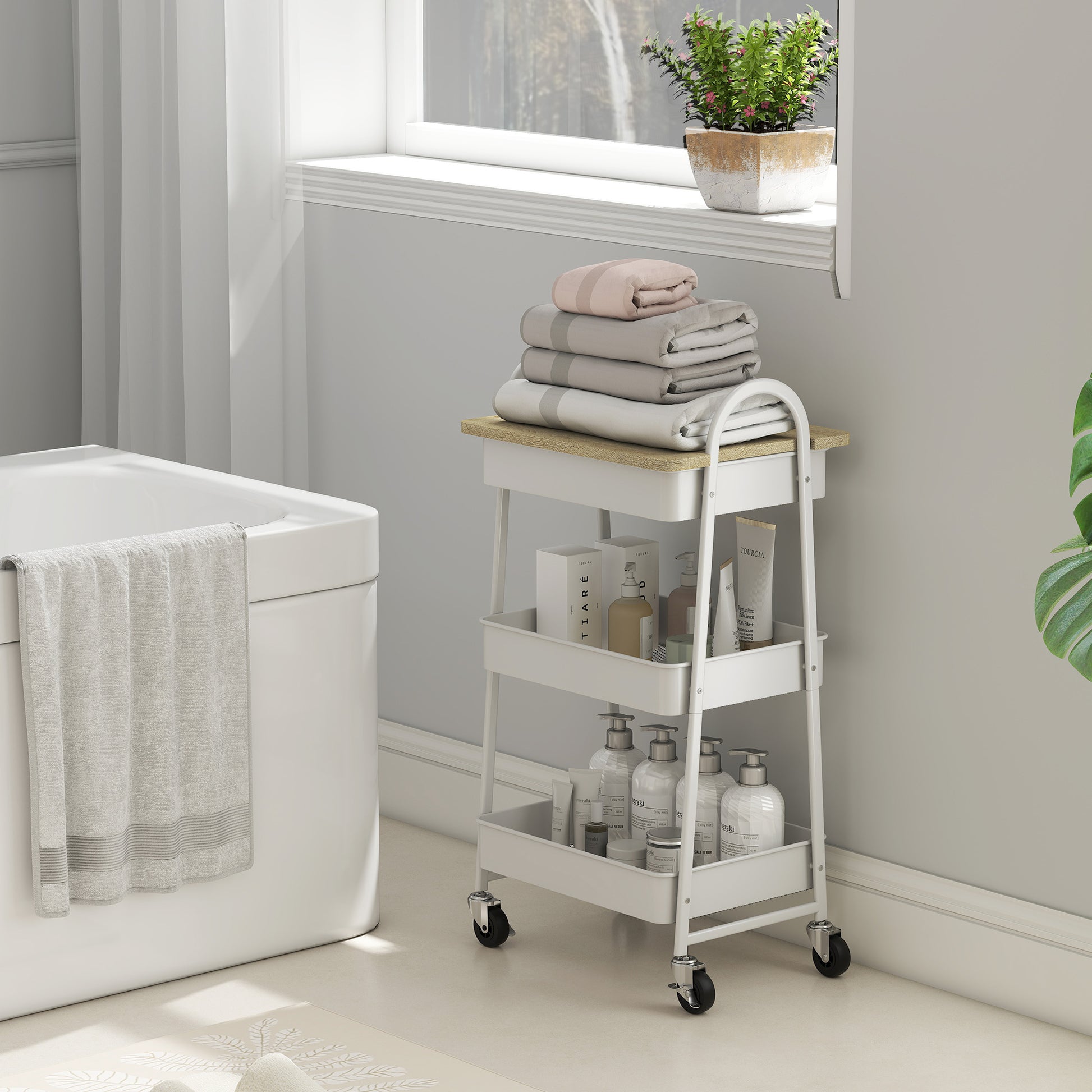 HOMCOM 3-Tier Kitchen Storage Trolley with on Wheels Cover Top Board - White and Oak