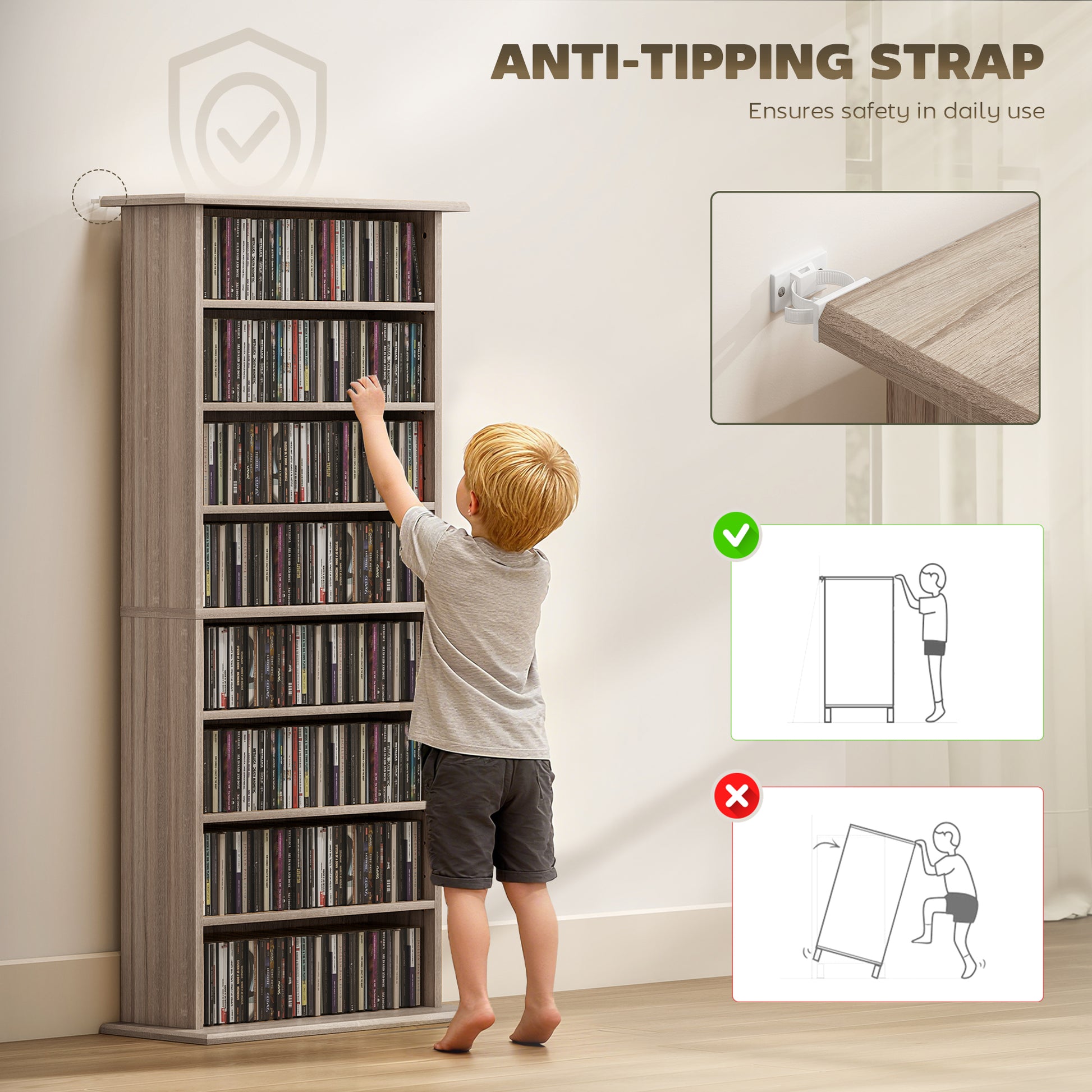 This HOMCOM DVD rack showcases 8 shelves, with 6 adjustable shelves: room for up to 360 CDs, 185 DVDs or 185 Blu-rays. Made from particle board, the CD shelf's structure is reliable and is made to be used every day. Coming with anti-tipping straps to fix to a wall, so our HOMCOM DVD shelf doesn't fall forwards and cause damage.