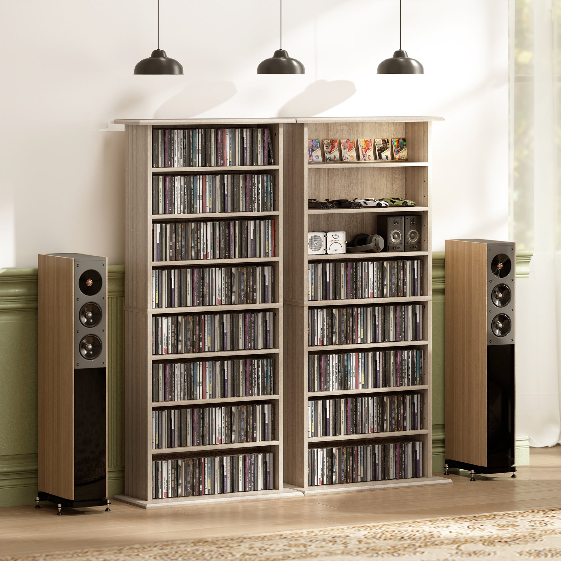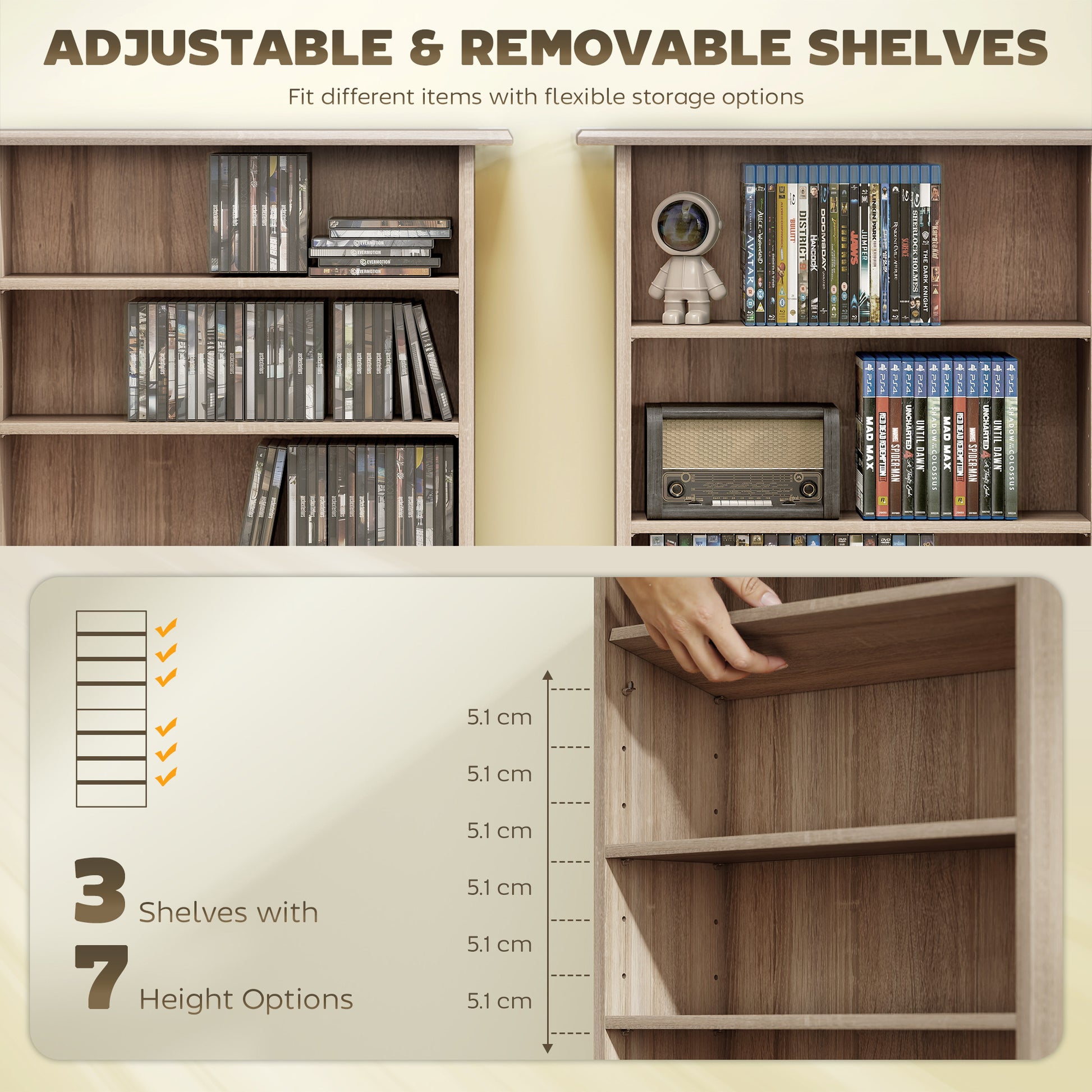 - 8 compartments, with 6 adjustable shelves: room for 360 CDs, 185 DVDs or 185 Blu-rays