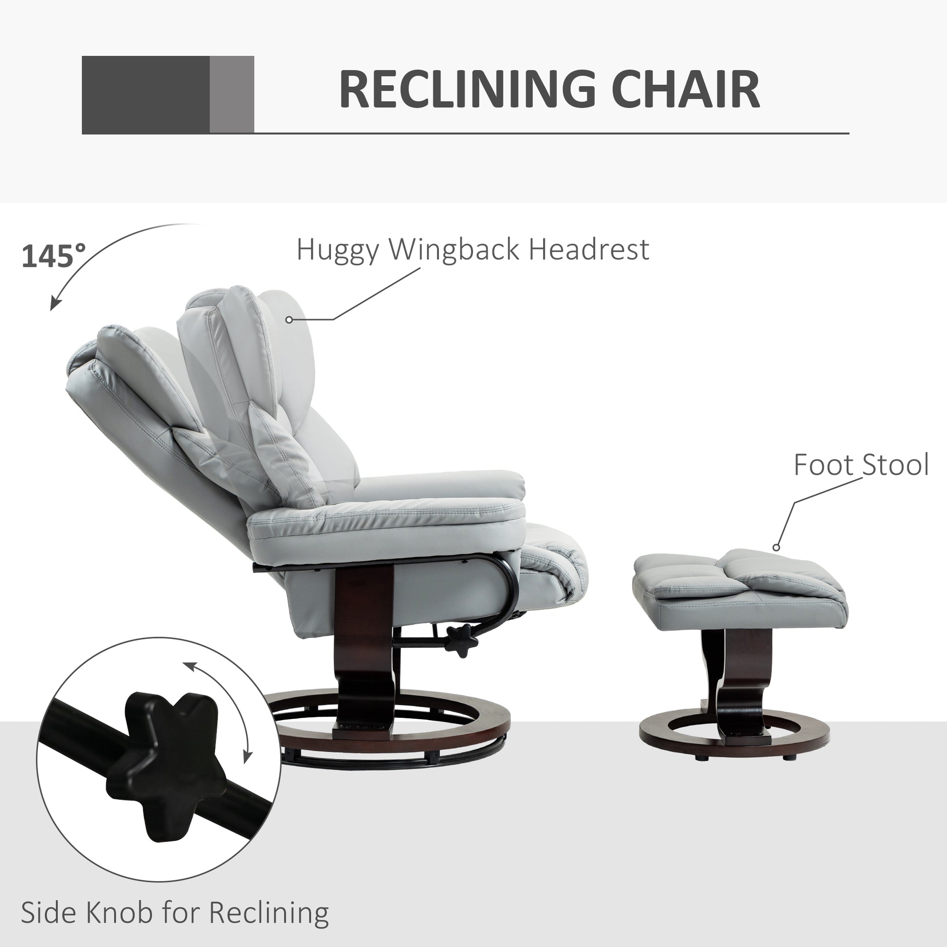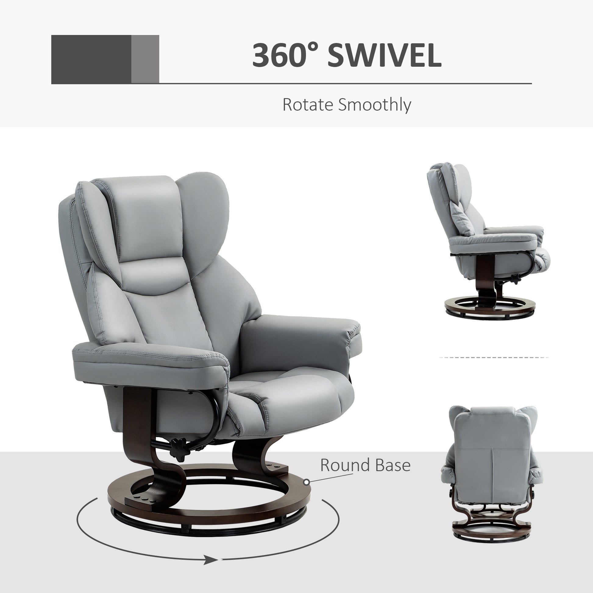 HOMCOM 360° Swivel Recliner Chair with Footstool, PU Leather Manual Recliner Armchair with Footstool, Solid Wood Base, Upholstered Reclining Chair for Living Room, Bedroom, Office, Light Grey