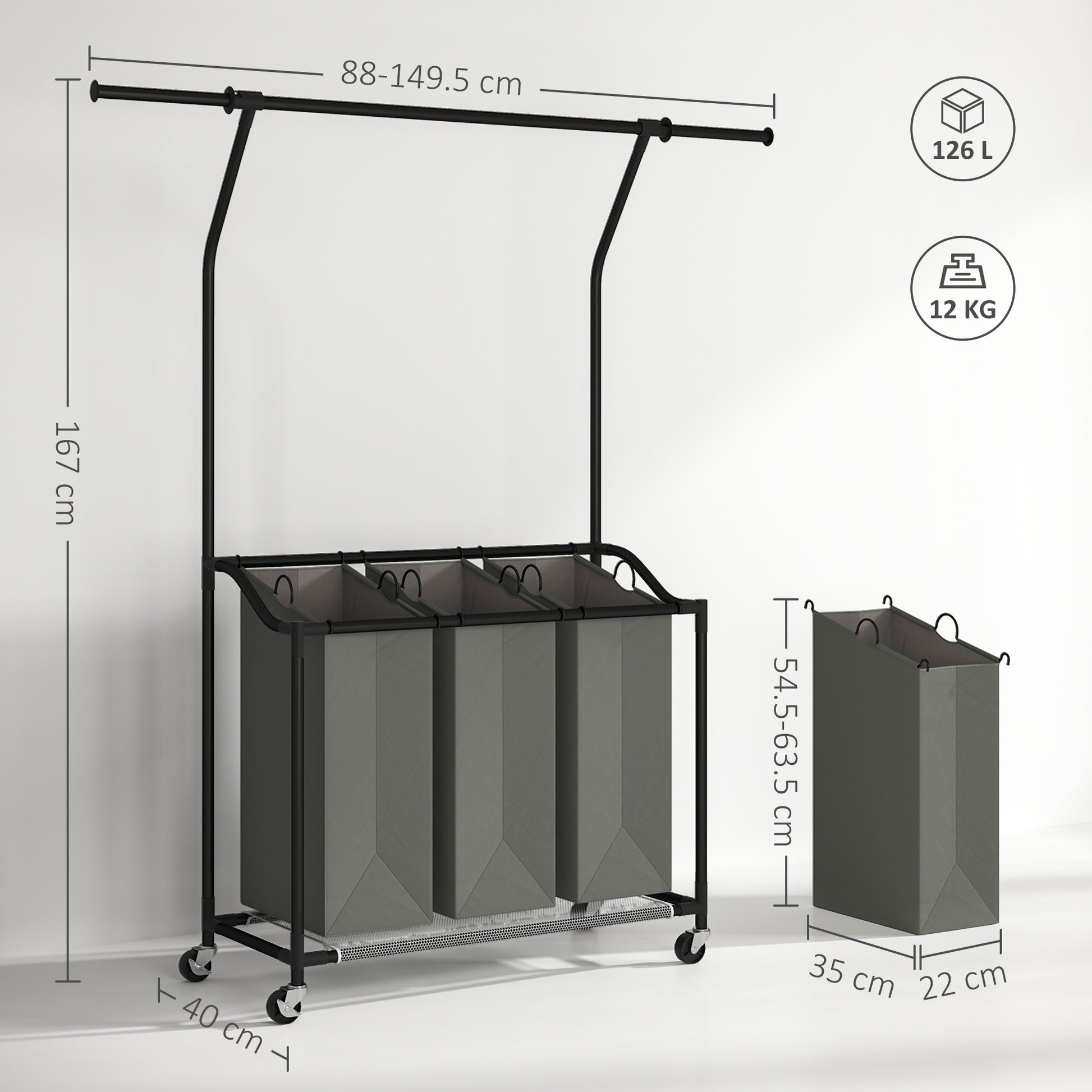 - Weight Capacity: 12 kg (total), 3 kg (hanging rail), 3 kg (each bag)