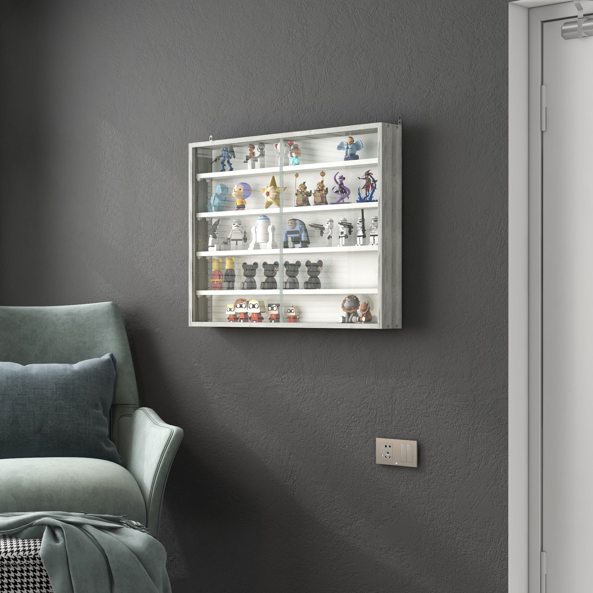 HOMCOM 5-Tier Wall Display Shelf Unit Cabinet w/ 4 Adjustable Shelves Glass Doors Home Office Ornaments 60x80cm Grey Wood Grain