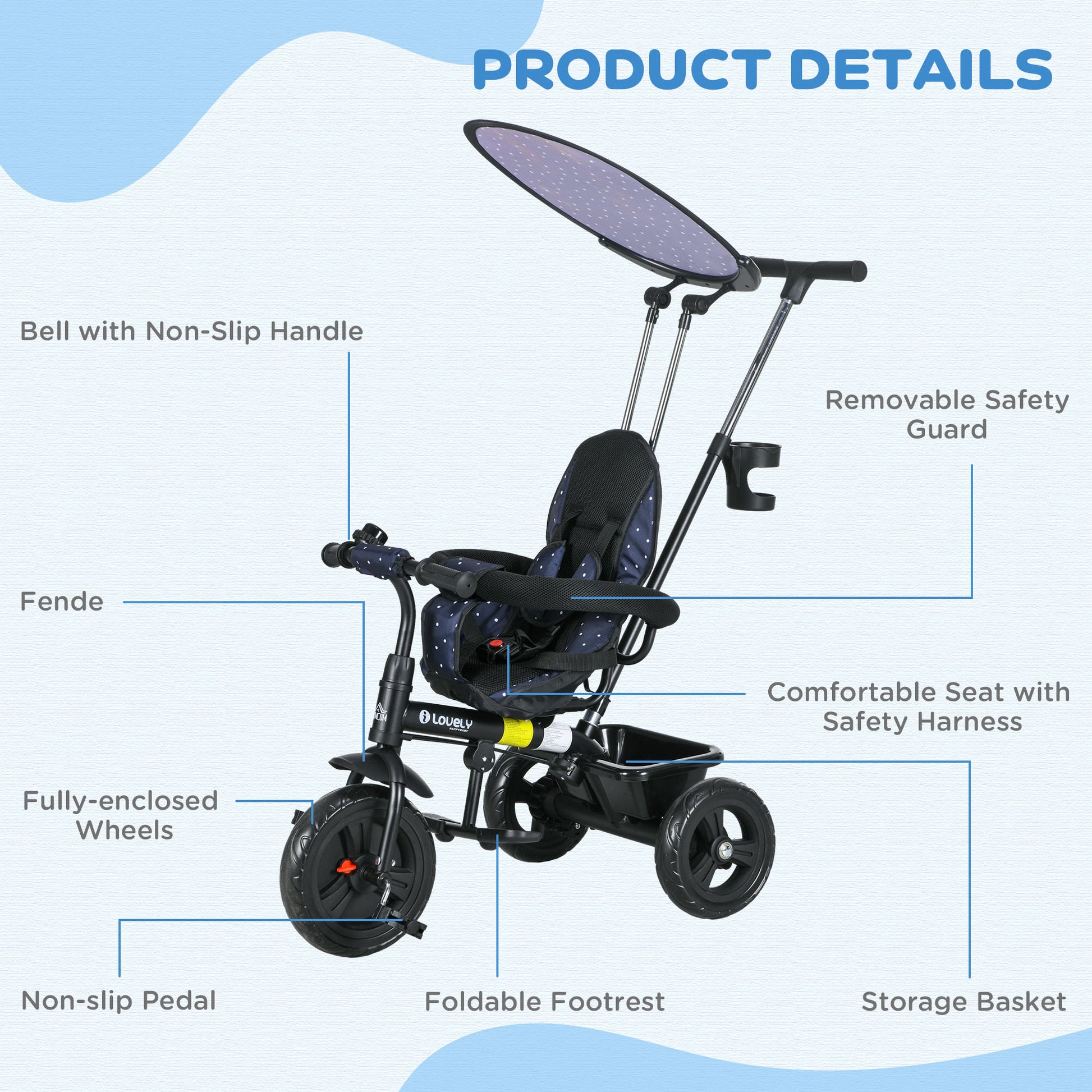 HOMCOM 6 in 1 Tricycle for Kids with 5-point harness straps, Removable Canopy, Dark Blue