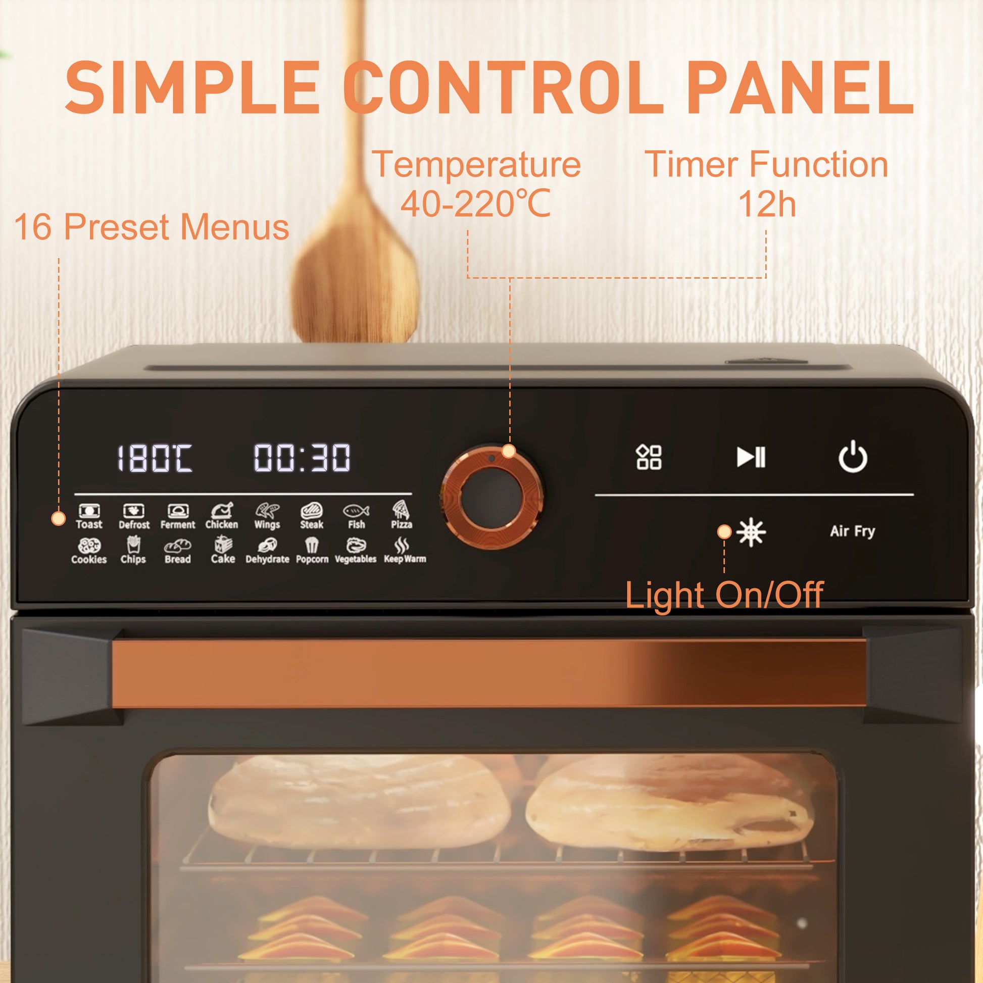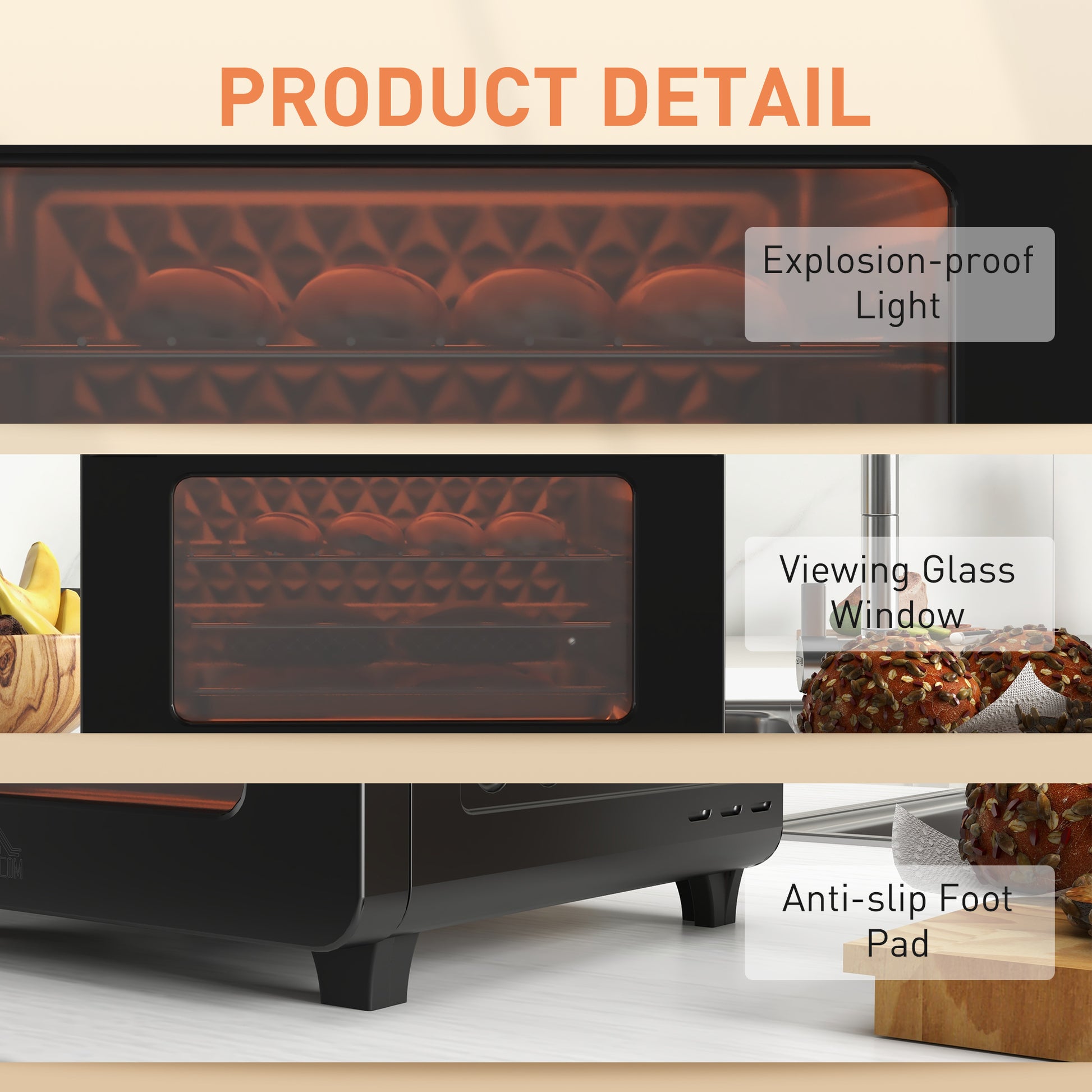 Retro style for the everyday: this HOMCOM convection oven is a piece to love using and having in your home. The black colour, chrome accents and slight boxy shape gives it an old-school look with a modern twist. Adjust the temperature between 40-220℃ easily, the thermistor control enables fast, precise closed-loop temperature control. Multifunctional design with 16 presets.