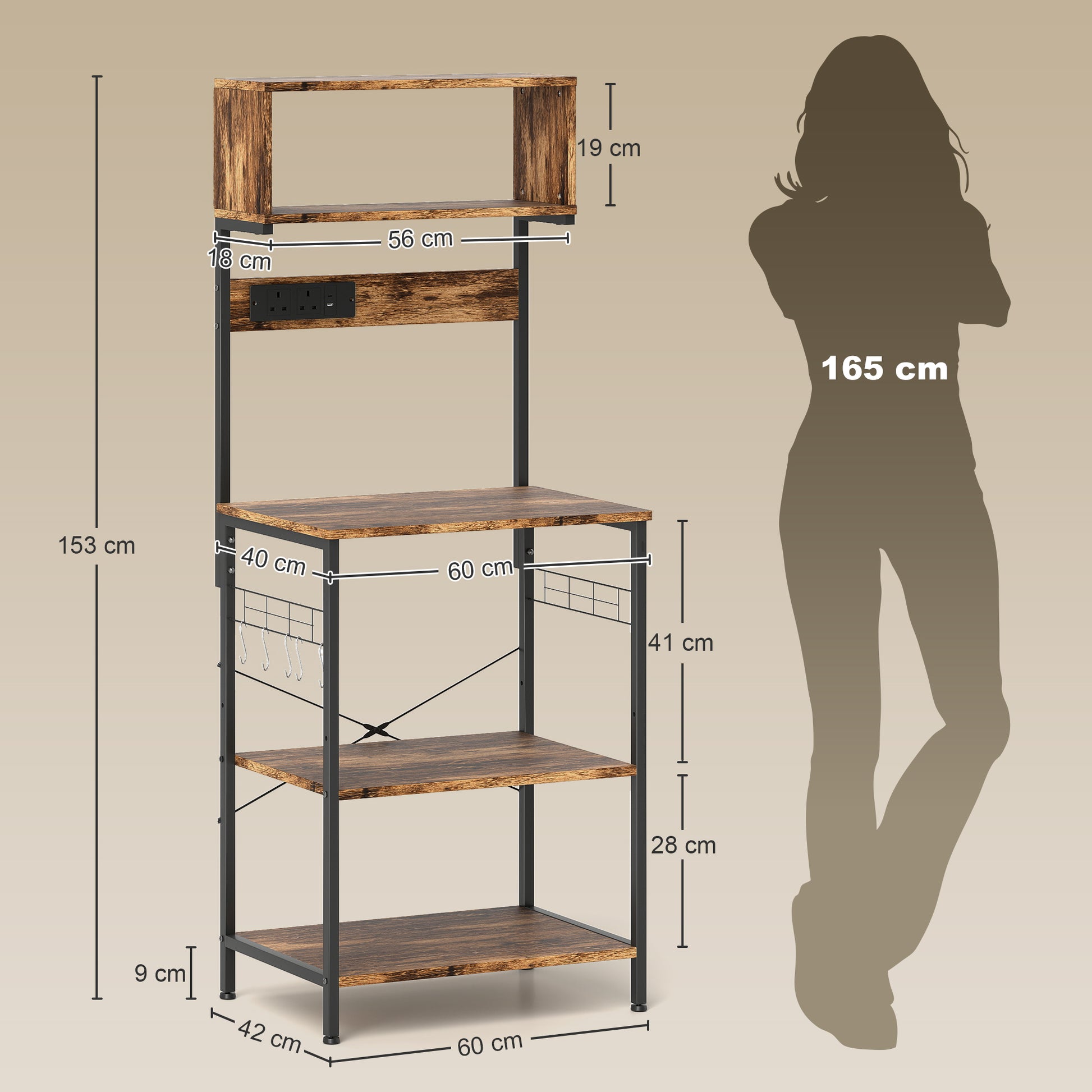 HOMCOM Bakers Rack with Power Outlet, USB Charger, Microwave Stand with Adjustable Shelves, 5 Hooks for Small Spaces, Kitchen Storage Unit for Spices, Pots and Pans, Rustic Brown
