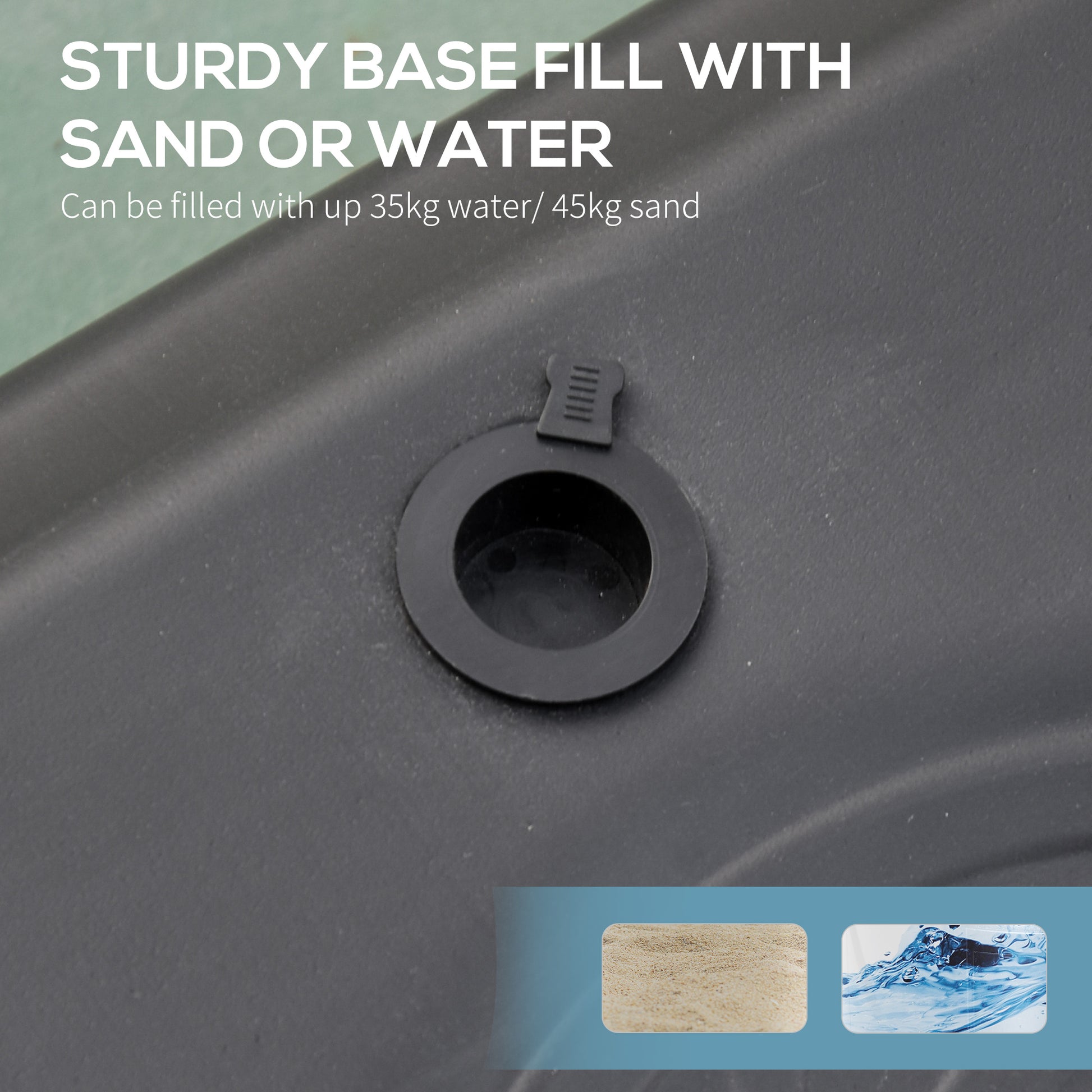 - The bottom base can be filled with water (30kg) or sand (35kg) for better stability
