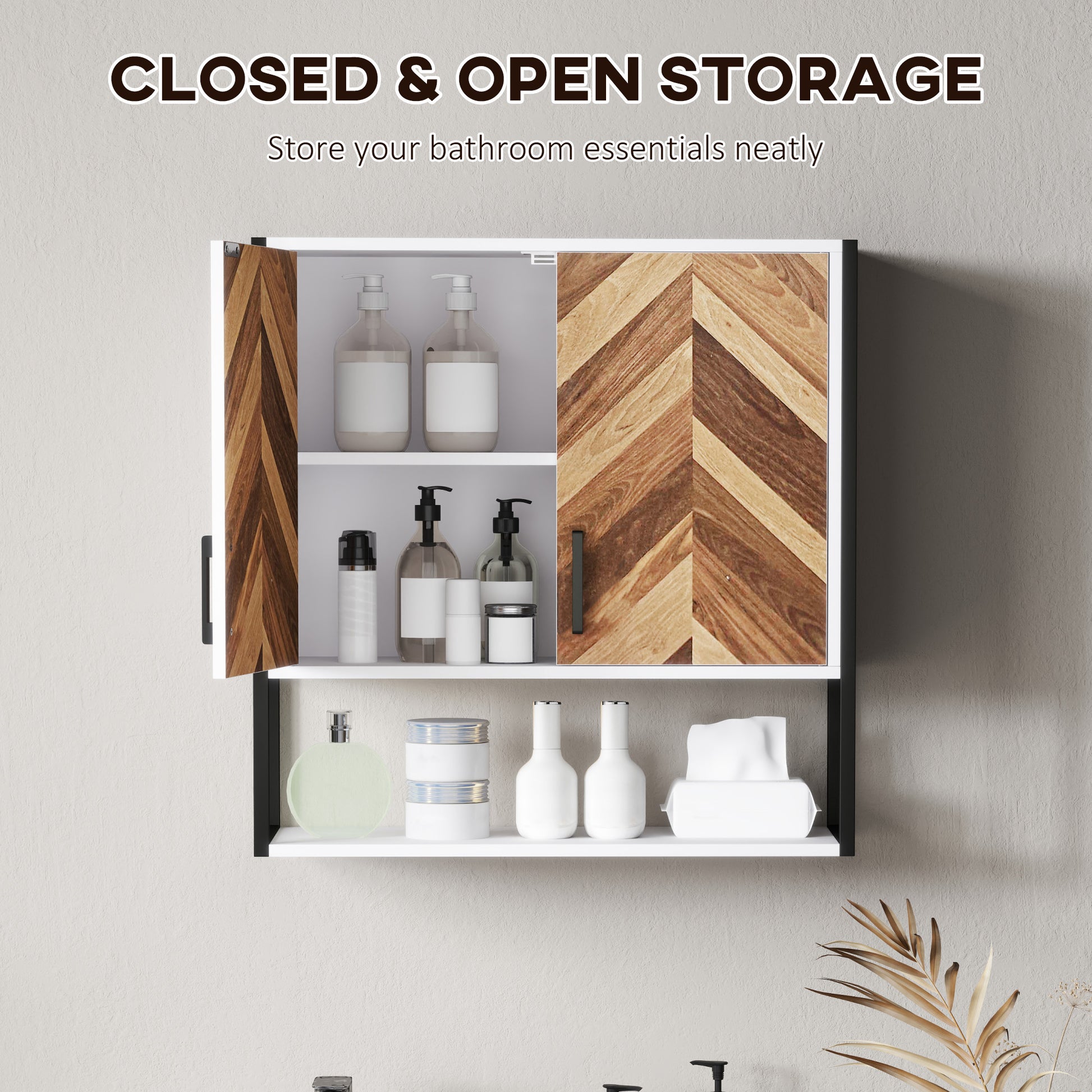 Maximise your bathroom's style and storage with the bathroom medicine cabinet from HOMCOM. This chic, space-saving solution features a two-tier cabinet with adjustable shelving and an open shelf, suitable for tucking away essentials. Its rustic staggered dark and light wood grain, woven in a herringbone style, blends functionality with elegance, making it a great addition to any contemporary bathroom.