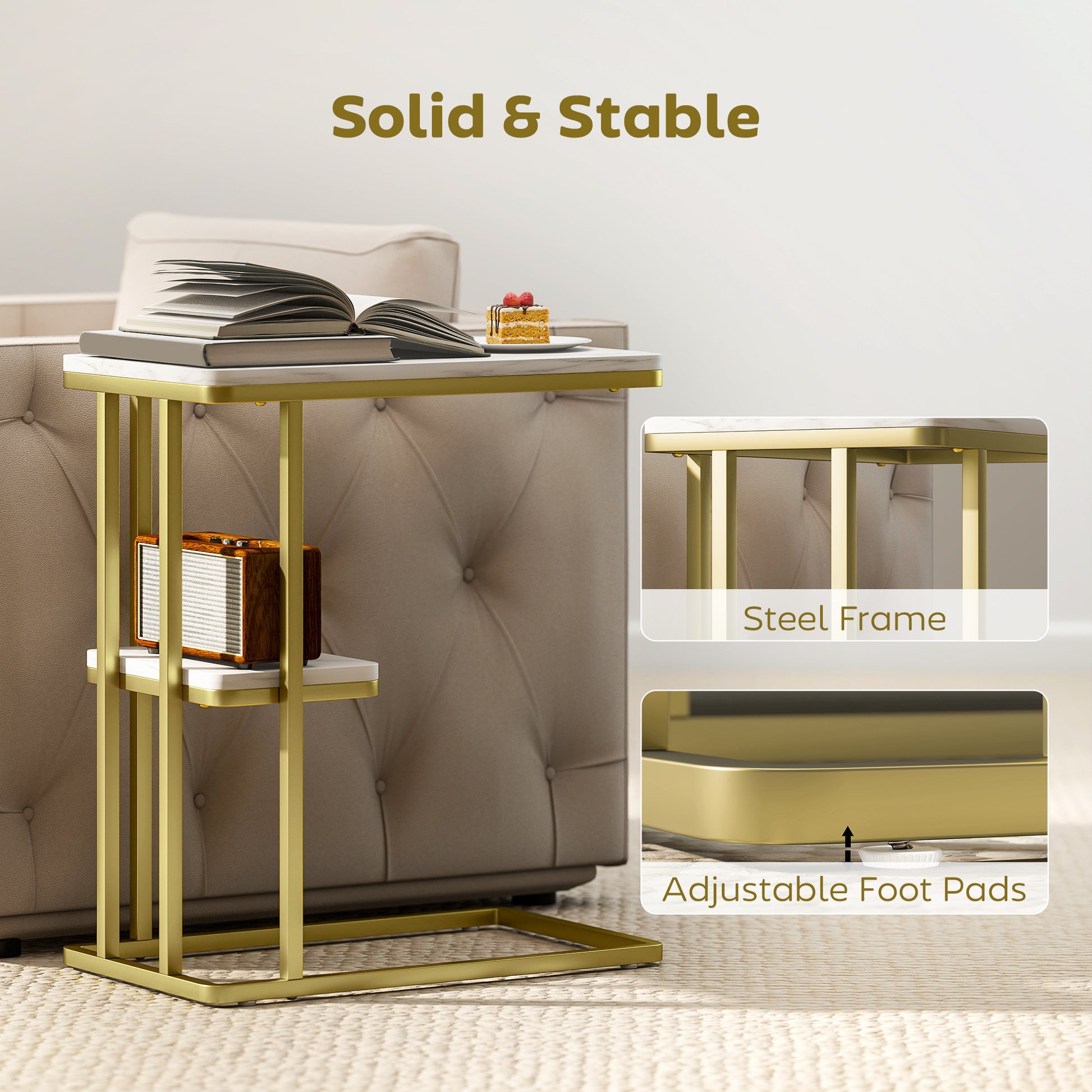 Discover the chic convenience of the HOMCOM side table! Unique C-shape makes this end table slide effortlessly under sofas or beds, bringing your essentials close—great for cosy nights or productive days. Enjoy clutter-free living with its 2-tier storage, excellent for tucking away books and snacks, all while adding a touch of elegance with its white marble-effect top and gold-tone frame.