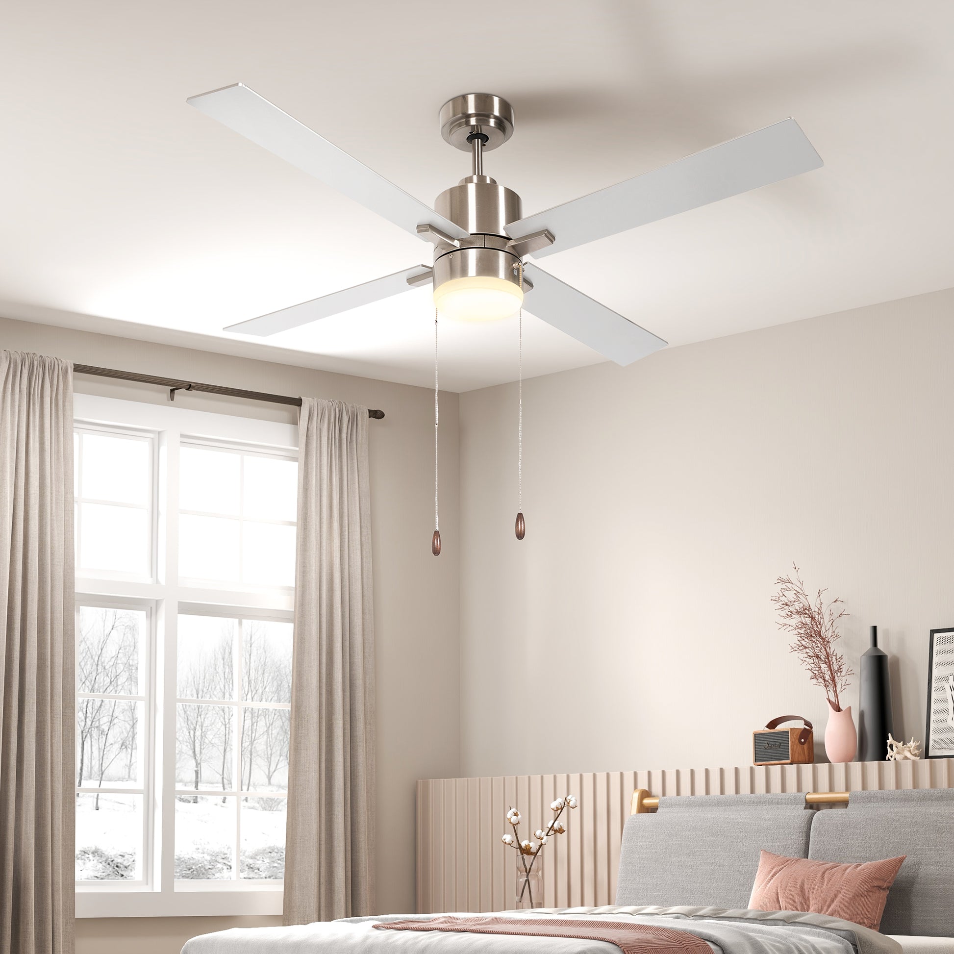 - Pull-chain switch, the light and fan can be controlled separately. Button of the body to change motor direction
