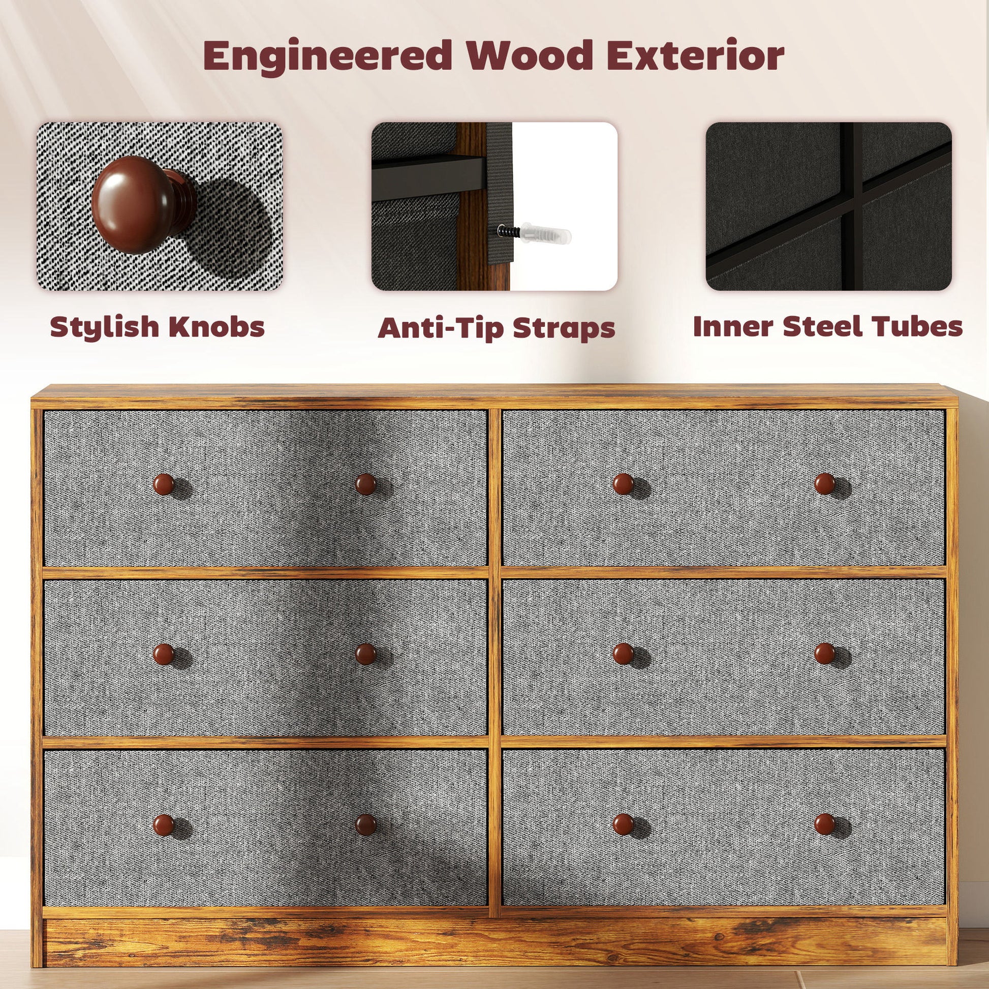 HOMCOM Chest of Drawers, Dresser with 6 Fabric Drawers - Grey and Rustic Brown
