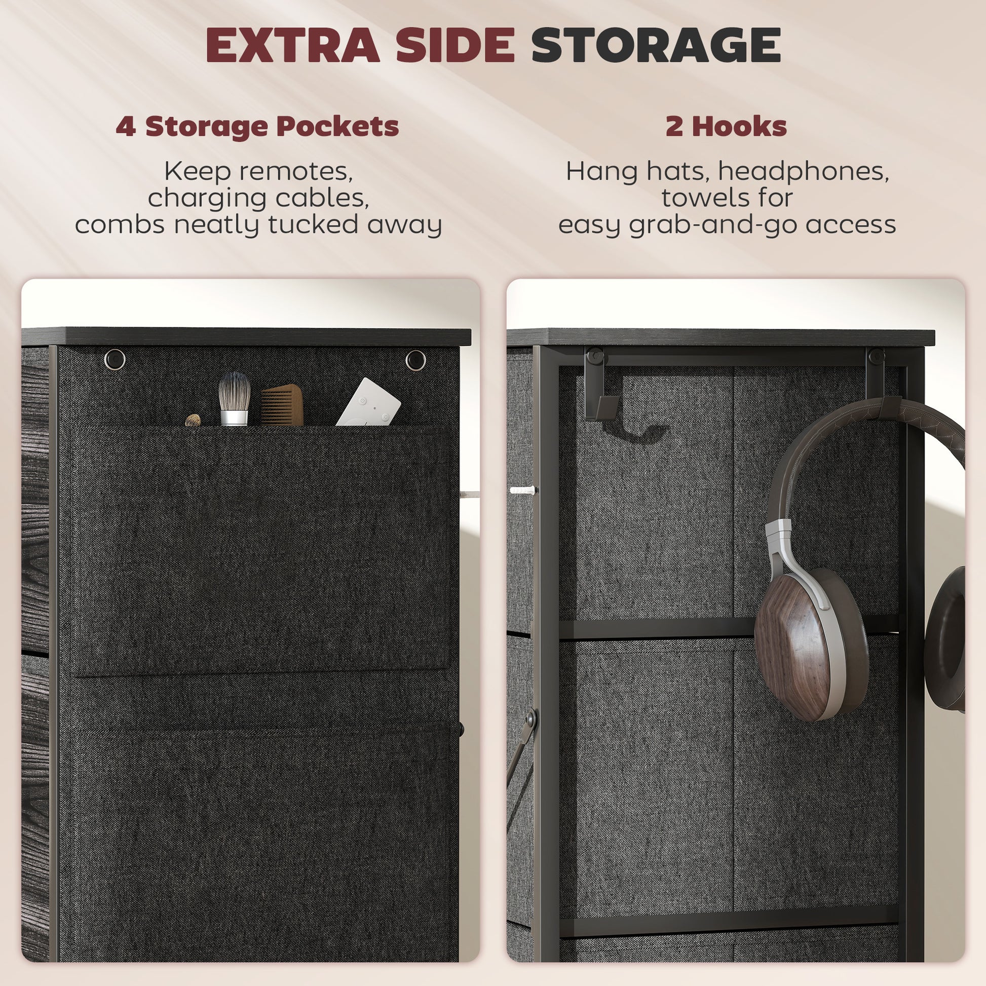 Easy, simple storage with this HOMCOM fabric chest of drawers. With eight same drawers, it's easy to sort everything from socks to pants. It also features four side pockets and two hooks to get smaller accessories altogether. A steel frame with X-bars keeps this bedroom dresser stable, finished with adjustable feet for balance - even on unsteady grounds.