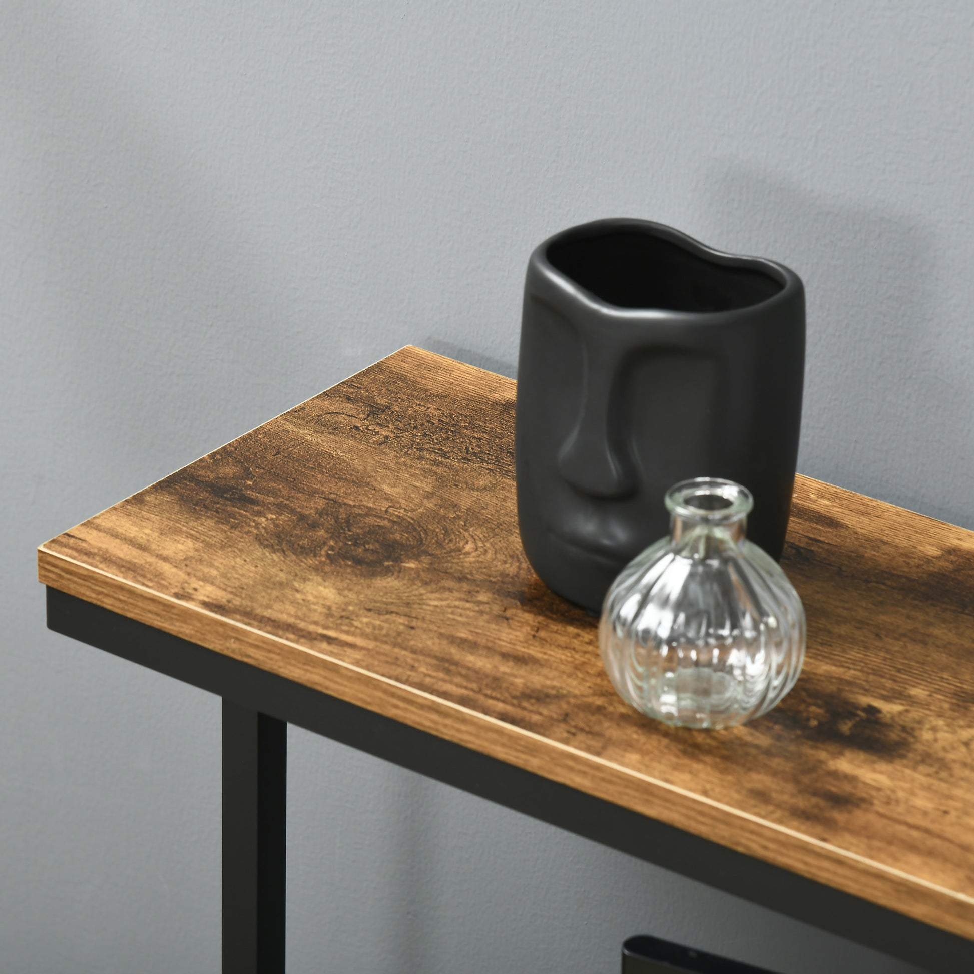 - Rustic wood grain pattern and black metal frame enhances an industrial style