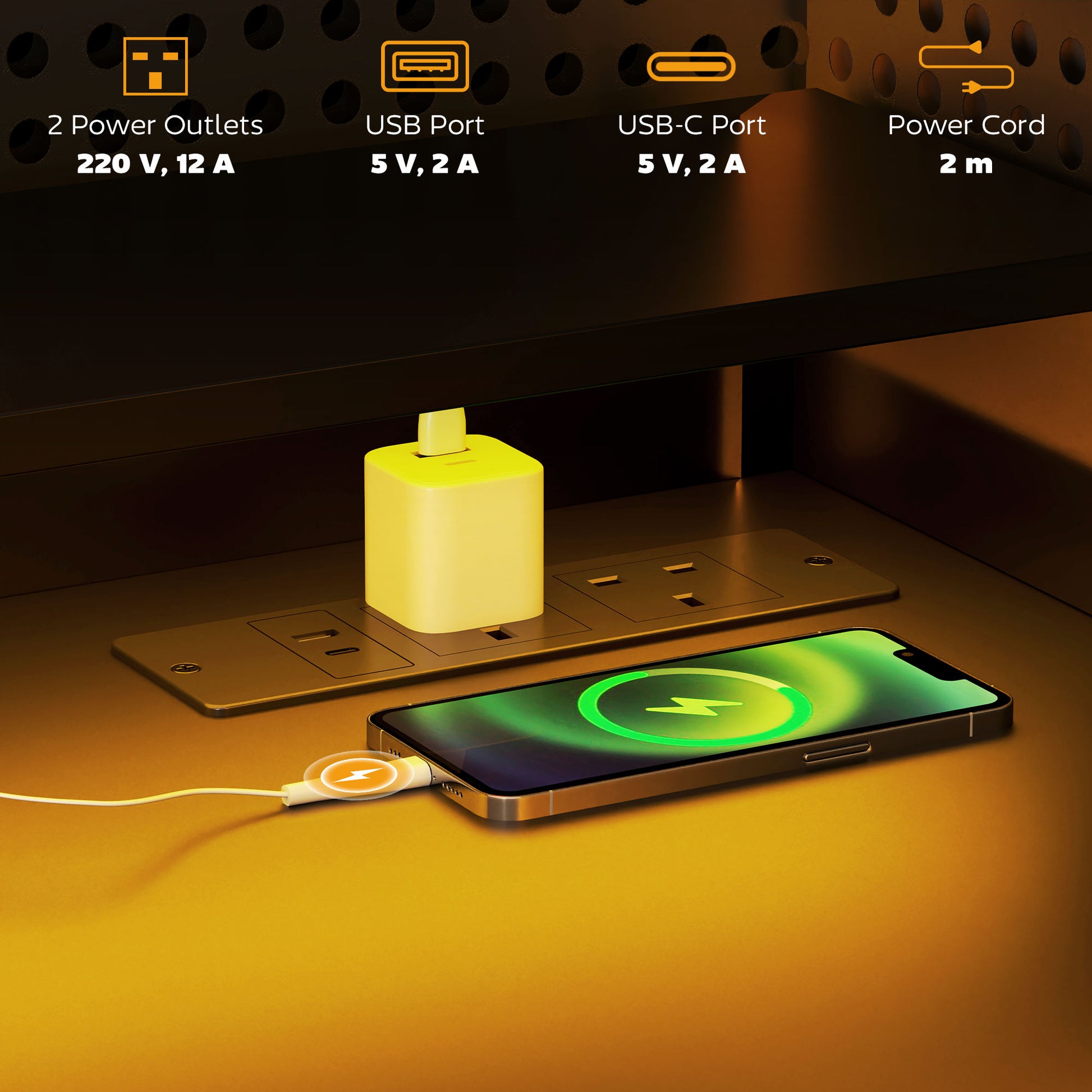 - Keep all your devices charged with two outlets, USB and USB-C ports