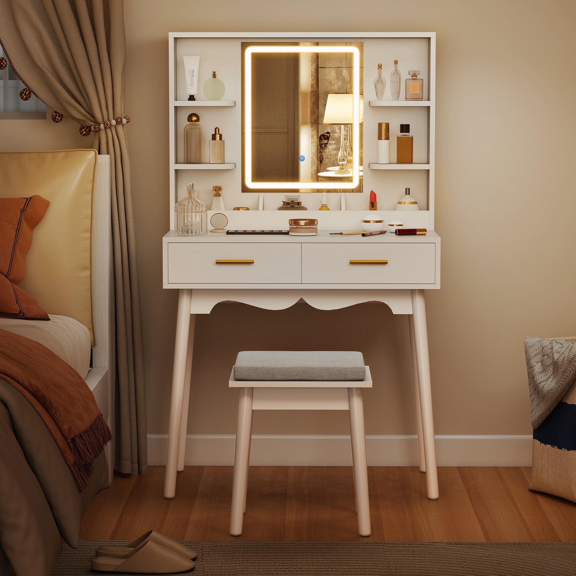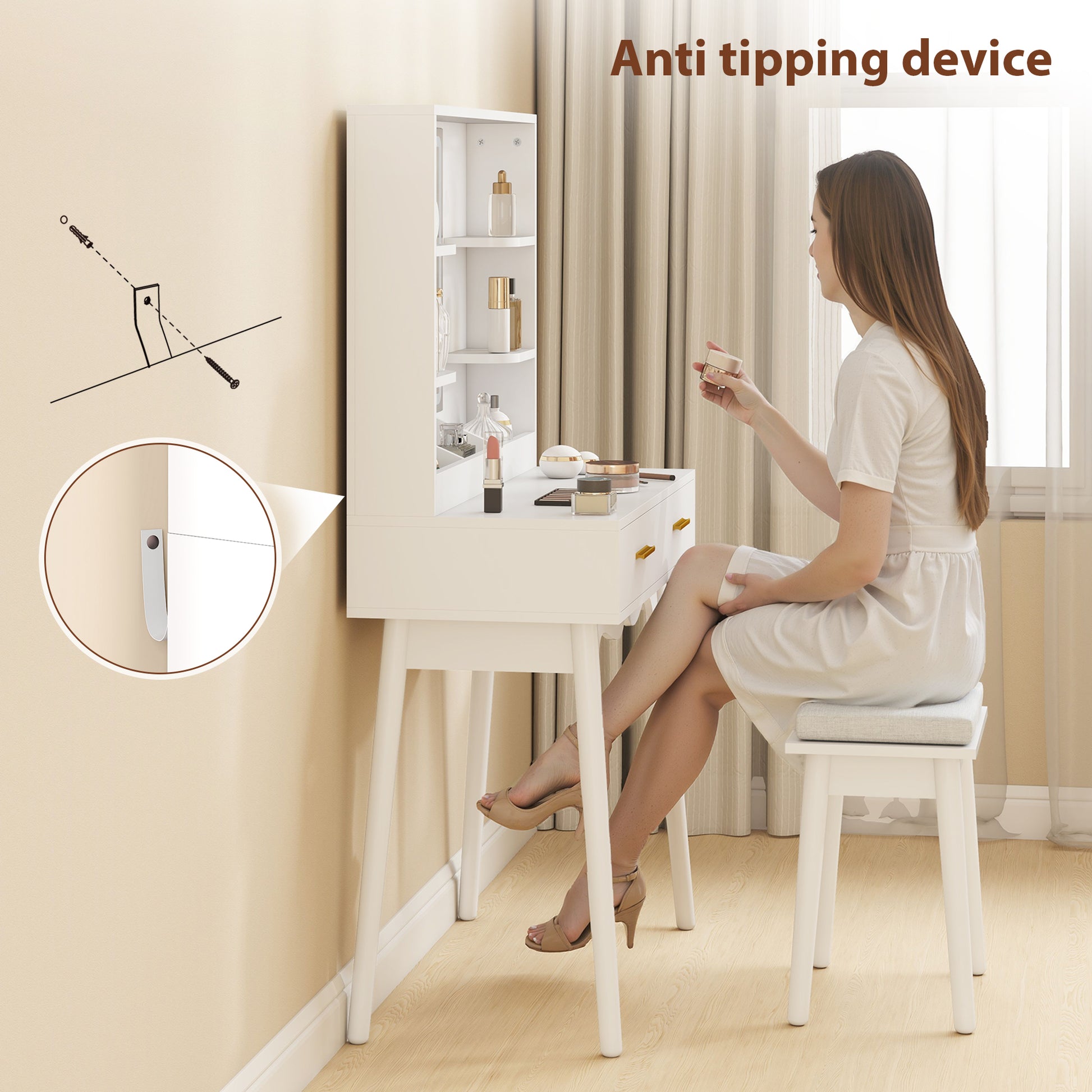 - Padded stool included. Sit comfortably when getting ready