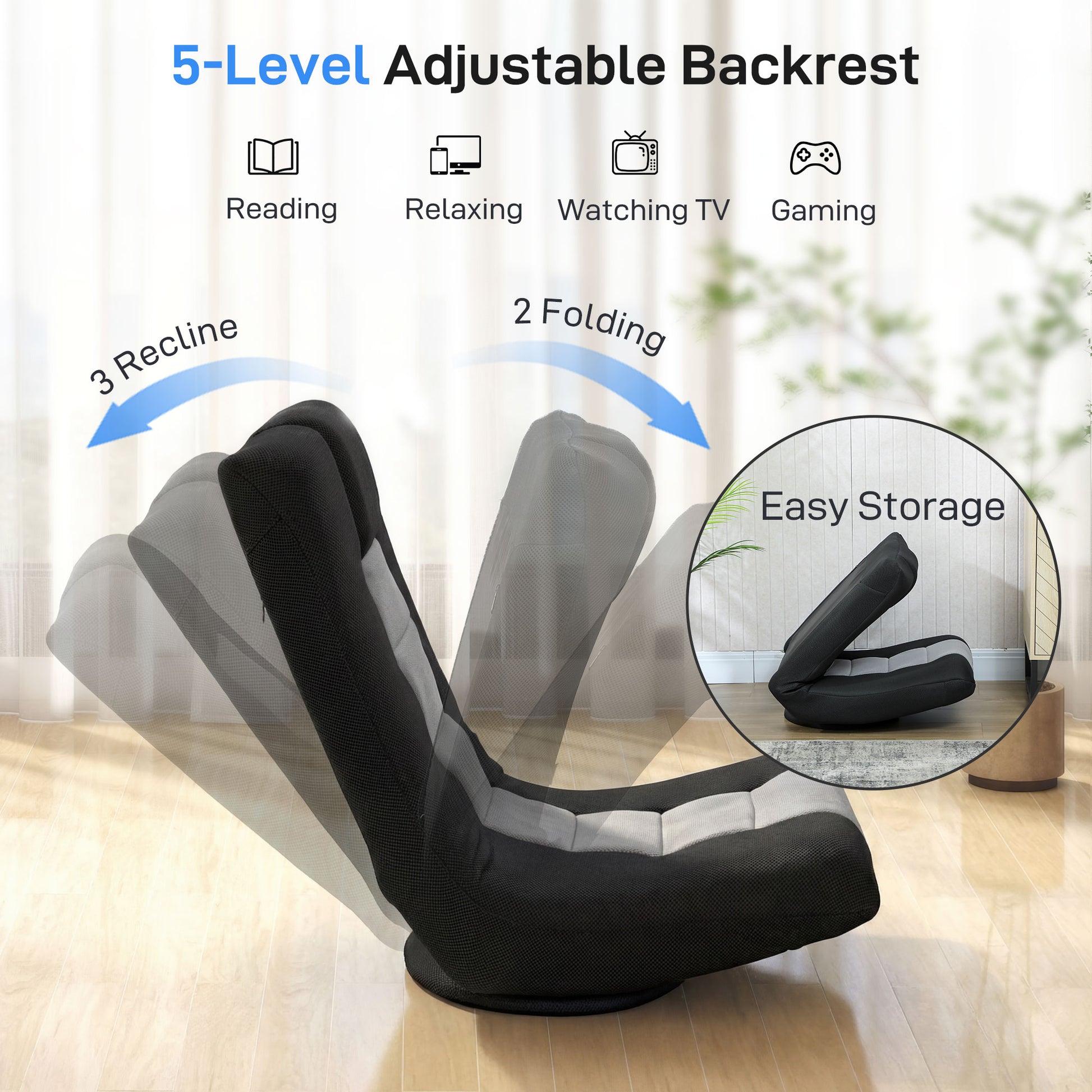 Make lounging a breeze with the HOMCOM floor chair! Its three recline angles let you relax just the way you want, making it great for reading, gaming, or unwinding. Need to save space? Fold it compactly using the two forward-tilt positions for effortless storage! Crafted with breathable mesh fabric and a 13 cm thick seat, this folding sofa chair keeps you cool and comfy during long sessions. Sit back, swivel and enjoy!