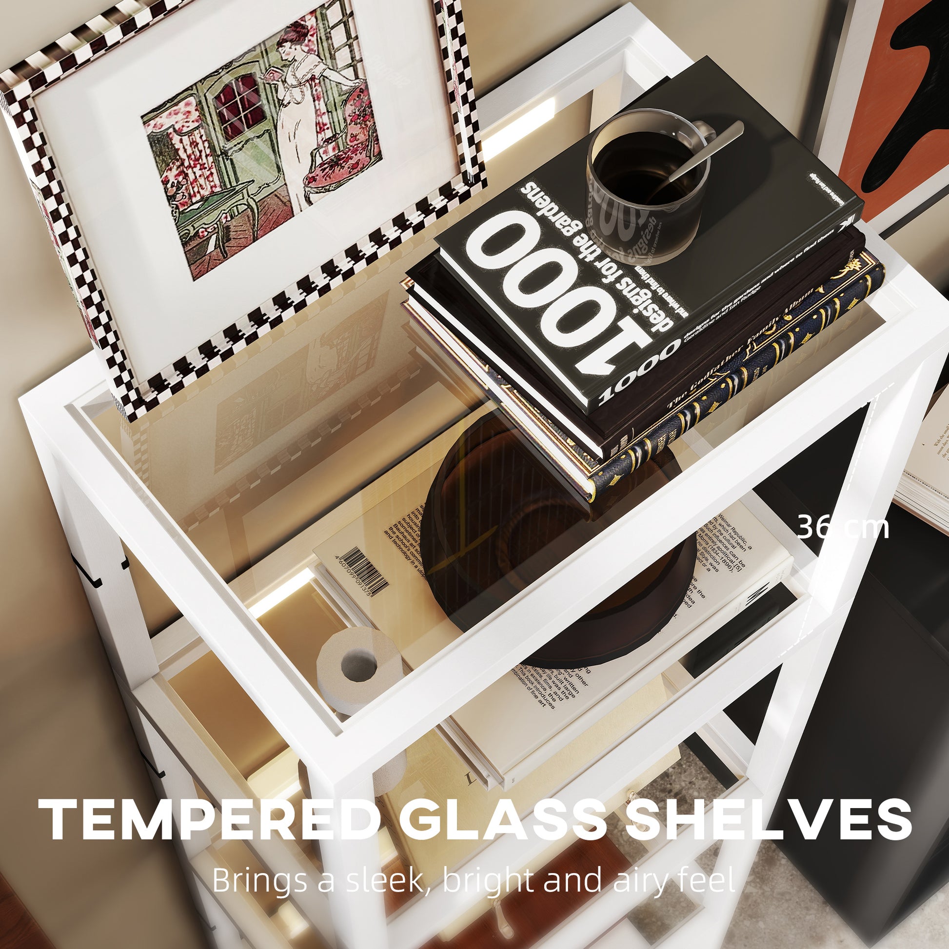 Merging together warm ambience and handy storage, with this HOMCOM floor lamp light. Fitted with four warm white LEDs, which adjust between three levels - set the ambience you want. It has four shelves - storage to keep your favourite pieces on show. The tempered glass shelves are sleek and allow the light to pass through from top to bottom.