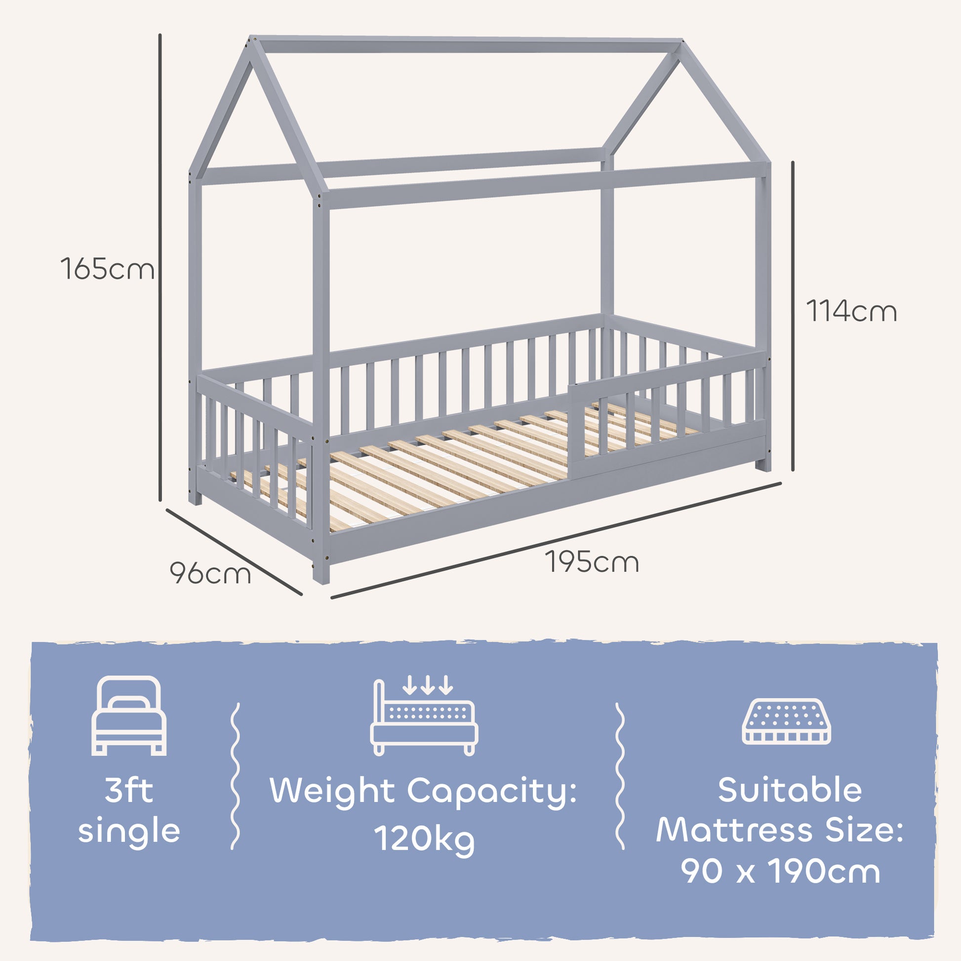 HOMCOM House-Shaped Kids Bed Frame with Guard Rails, Solid Pine Wood Single Bed Frame for Kids Boys and Girls, Grey