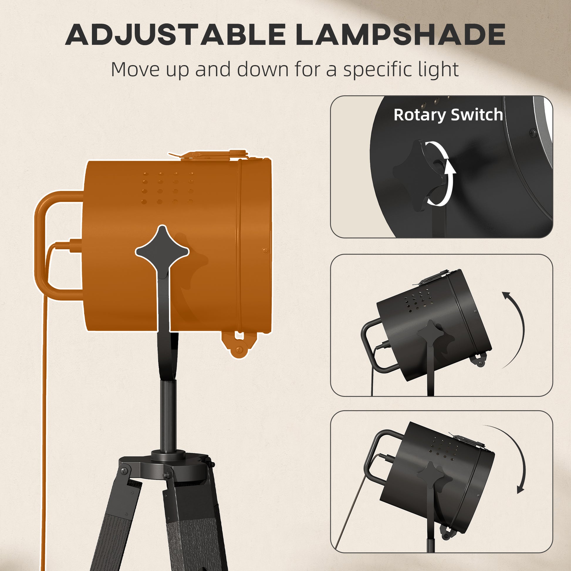 HOMCOM Industrial Tripod Floor Lamp, Nautical Searchlight with Adjustable Height, Wood Legs, E14 Lamp Base for Living Room, Bedroom, Black