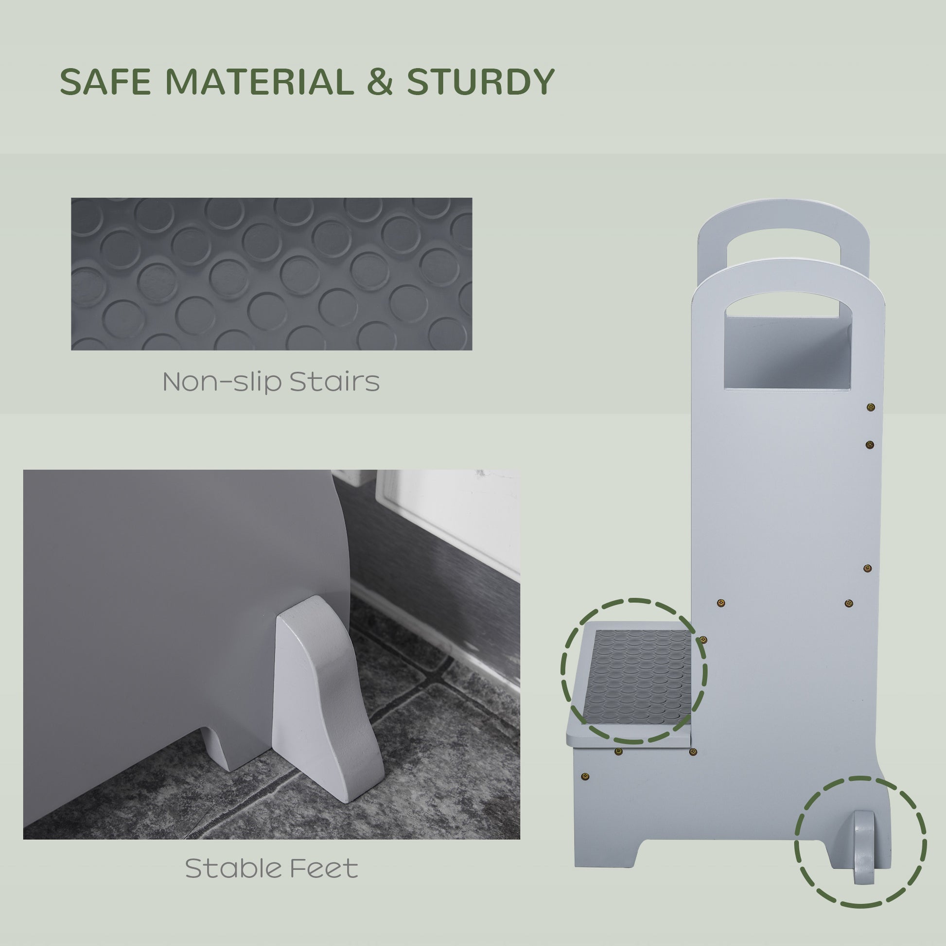 HOMCOM Kids Wooden Step Stool Kitchen Helper w/ Non-Slip Panels Handles Child Toddler Home Help 3 - 8 Yrs Grey