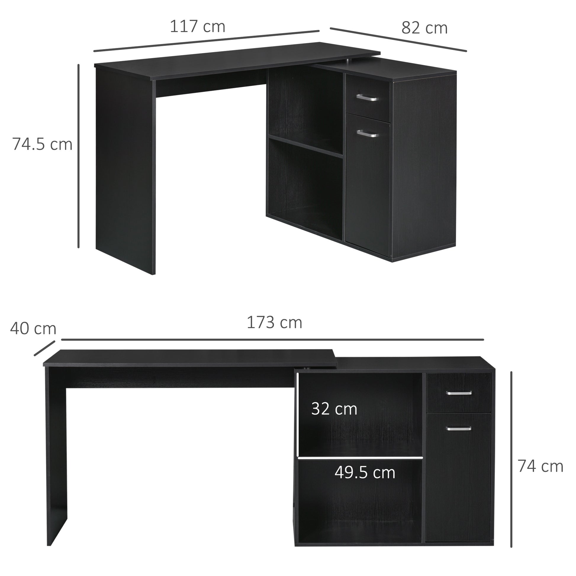 Efficiently save space with this computer desk from HOMCOM. Constructed from durable particle board with a smooth and easy-to-clean melamine surface, this ‘L’ shaped desk features a desk and shelf that rotates 180 degrees to suit you and the shape of your living space. Its large surface gives you plenty of room to work, and the extra storage is great for keeping all your important papers and other work documents. Clean black, it will blend beautifully into any style décor.