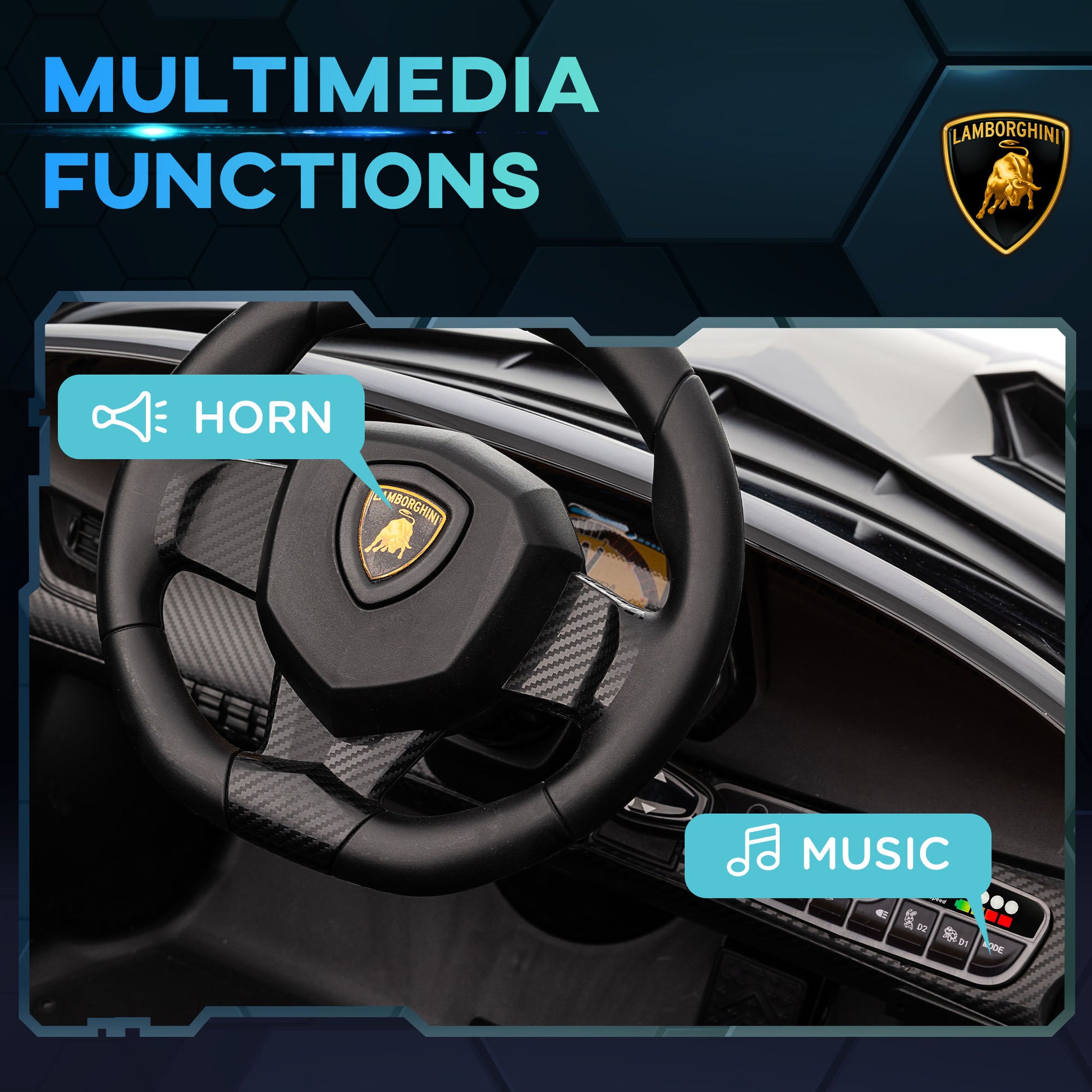 Fuel your child's imagination with this HOMCOM electric ride on car with remote control. Designed to amaze and excite, it's a licensed Lamborghini; a sleek look with butterfly doors. Like a real car, they'll have music, a horn and headlights to play with, adding realism to make-believe games. Safety is the first priority – the wide wheels, shock-absorbing suspension system and seatbelt ensure this. There's even a remote control for adults to control the ride-on, so everyone can join the fun.