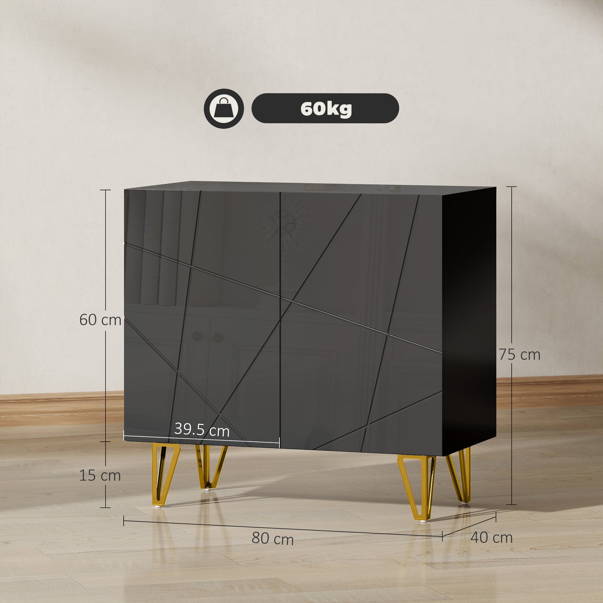 Keep your home stylish and tidy, with a touch of elegance - look to this HOMCOM sideboard. A high gloss finish, covered with line indents and with gold coloured legs makes this is beautiful piece which effortlessly infuses elegance into your space. Inside, there are two large storage areas, offering plenty of storage; adjust the shelf to fit in differently-sized items easily. The living room cabinet comes with anti-tipping straps to fix securely to a wall.