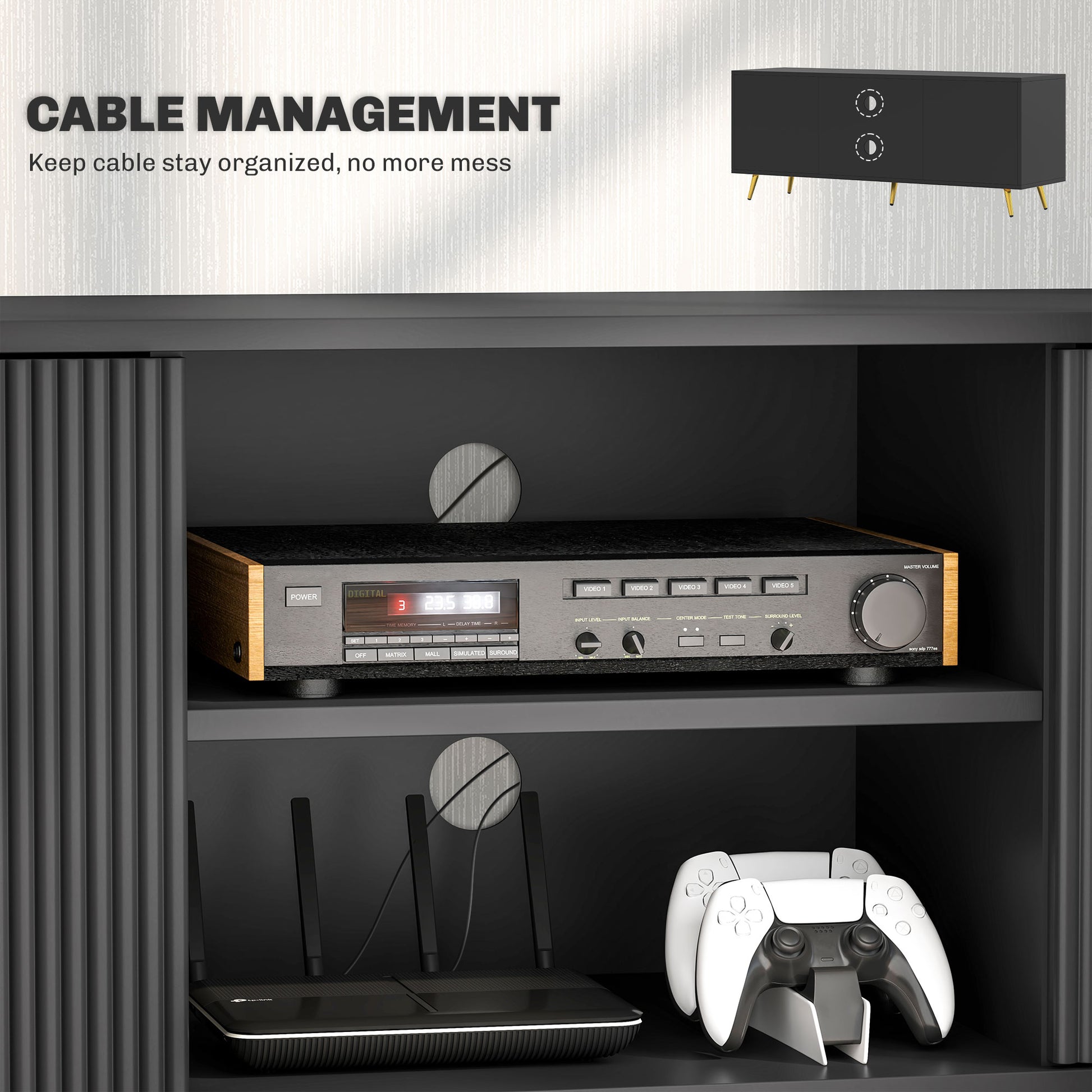 - Two cable holes keep wires tidy and organised