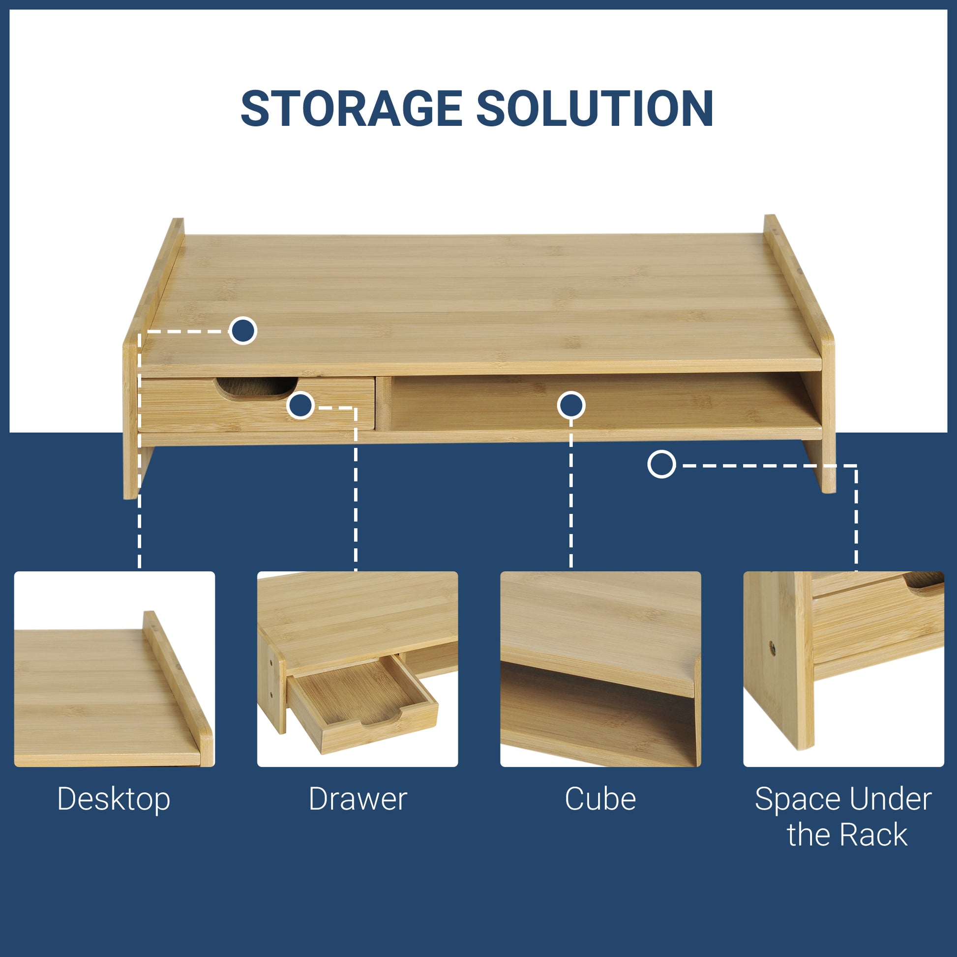 HOMCOM Monitor Riser Laptop PC Plinth Stand TV Computer Desktop Organiser W/ Drawer Bamboo