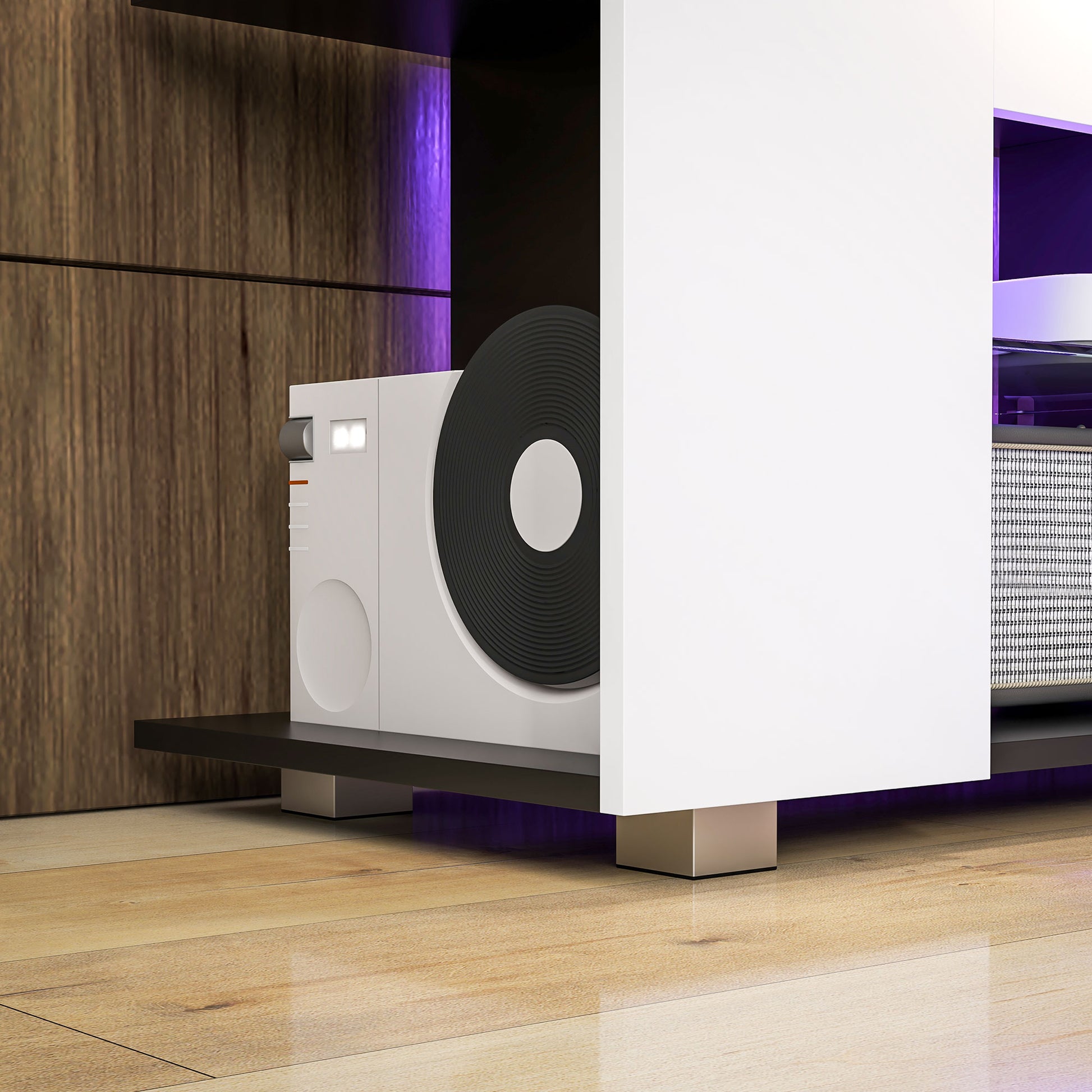 Your TV media unit, your way. This HOMCOM cabinet comes fitted with LED light strips: 12 colourways with four different modes - flash, strobe, fade, smooth - to set the ambience up how you want. Made from durable particle board to be used everyday, this TV cabinet is suitable for everyday use, and comes with four inner shelves and two outer compartments to allow plenty of storage and display.