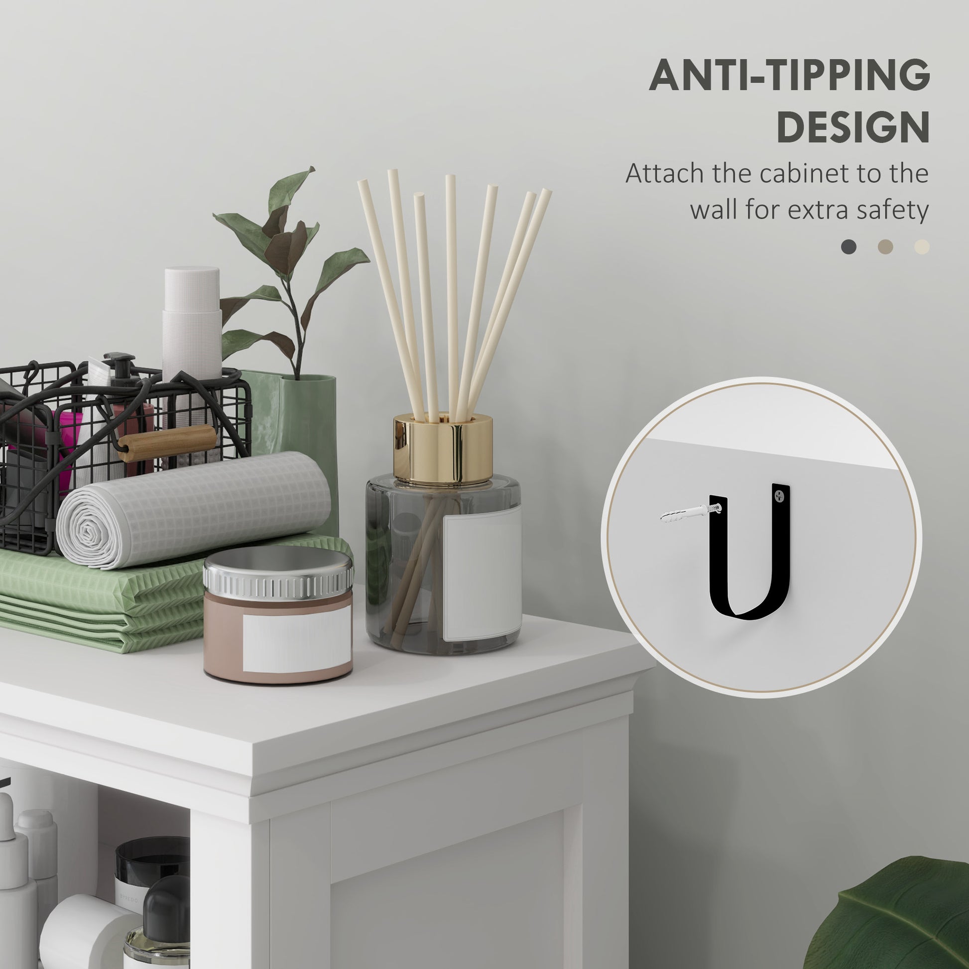 Even small spaces need an extra helping hand, so give yours plenty with this HOMCOM freestanding cabinet. Formed from MDF, this small bathroom storage cabinet is a solid piece suitable for everyday use. Comes with two top shelves and a bottom cupboard - enough room for all the essentials; complete with adjustable shelves for more personalised storage. The anti-tipping straps to attach to the wall for safety.