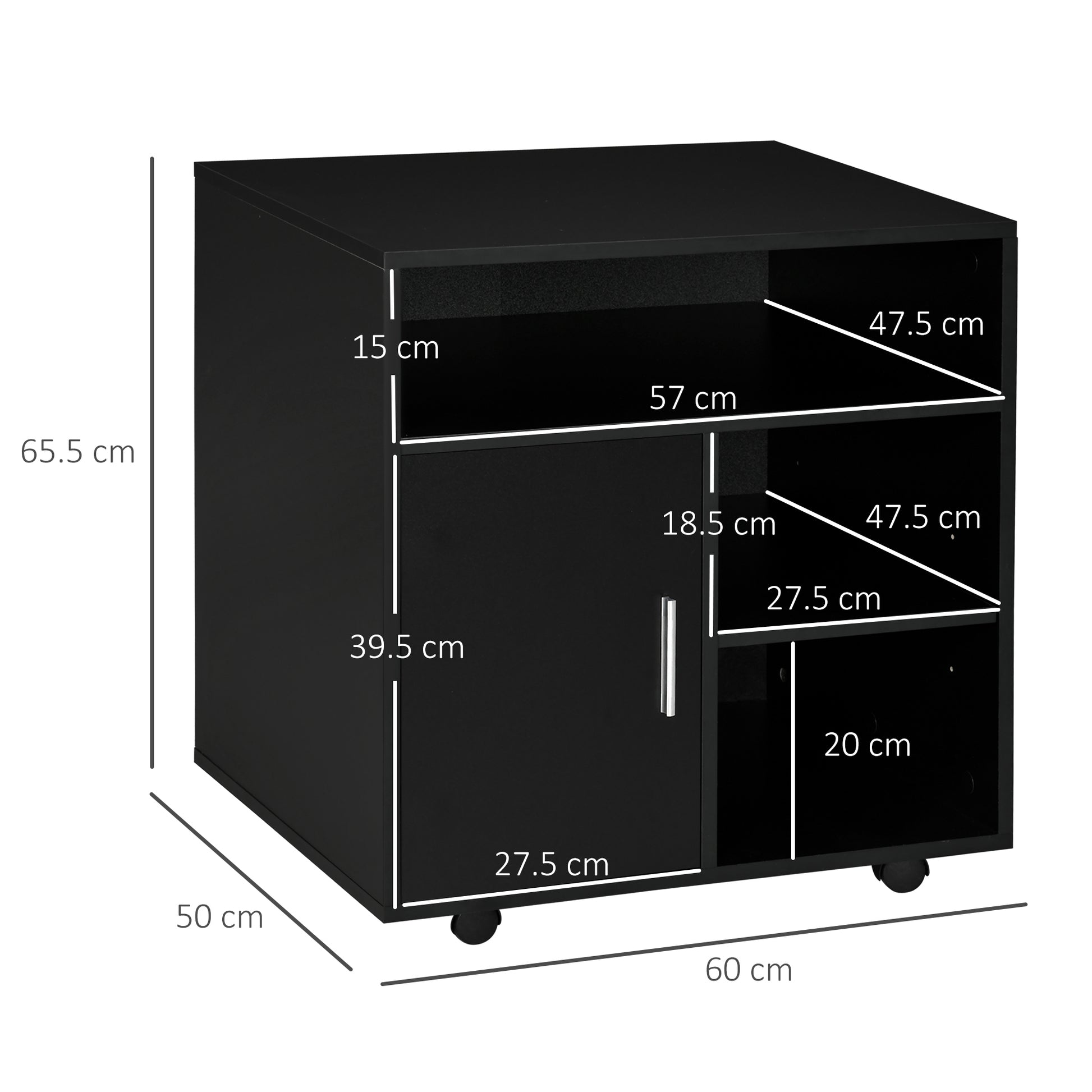 - Overall Dimensions: 65.5H x 60W x 50Dcm. • Top Compartment Size: 15H x 57W x 47.5Dcm. • Top Cube Compartment Size: 18.5H x 27.5W x 45.5Dcm.• Bottom Cube Compartment Size: 20H x 27.5W x 45.5Dcm. • Cupboard Size: 40H x 28W x 48Dcm. • Wheel Size: Ф4cm
