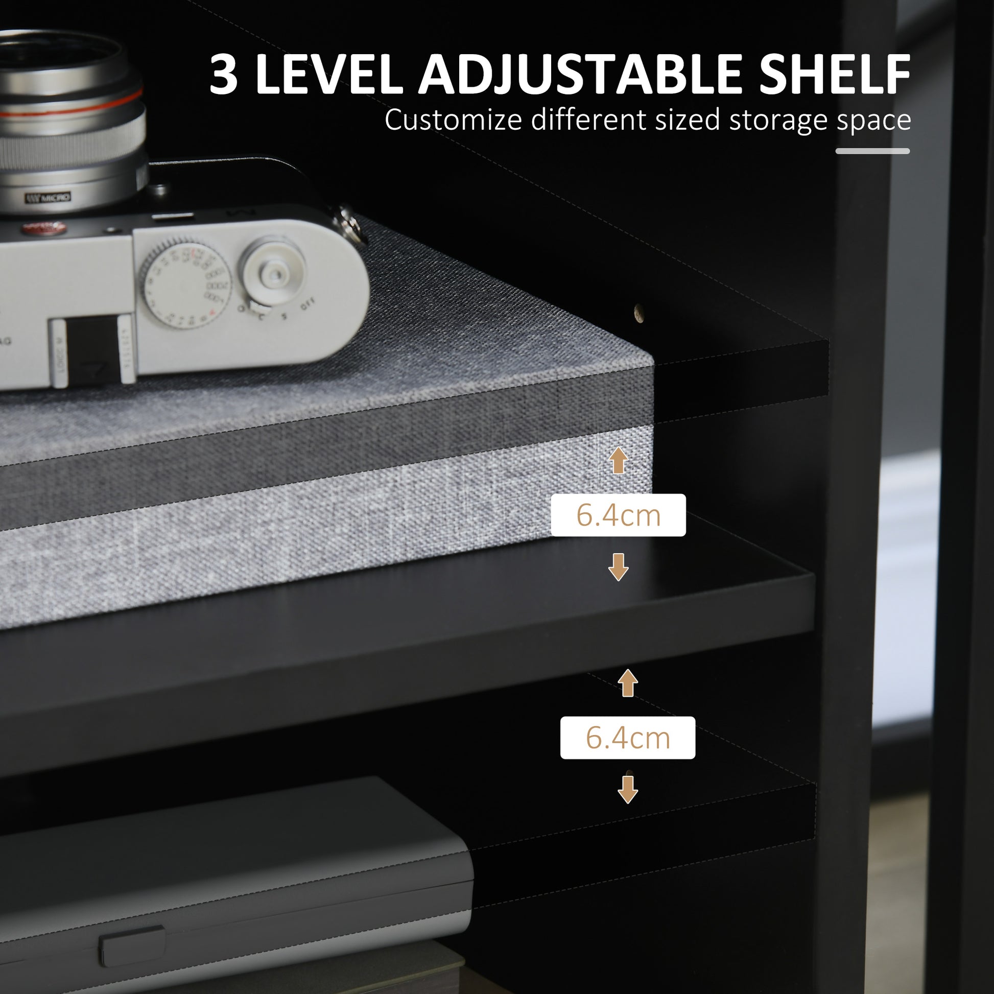 - The shelf in the right compartment is 3-level adjustable and removable