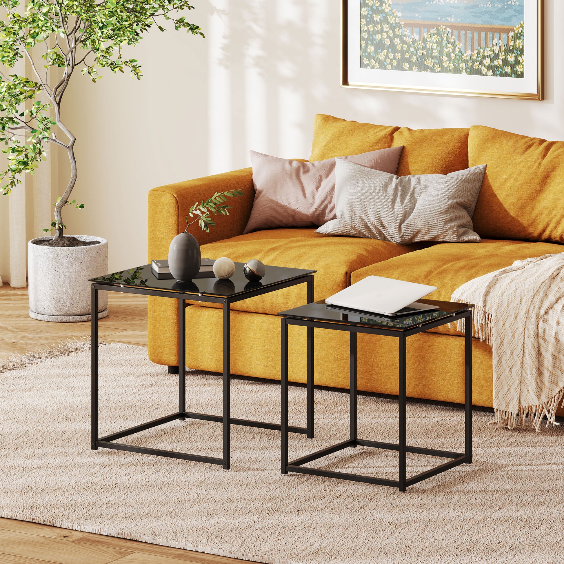 HOMCOM Nest of Tables, Set of 2 Coffee Table, Side Tables with Tempered Glass Desktop and Metal Frame for Living Room, Bedroom, Office, Black