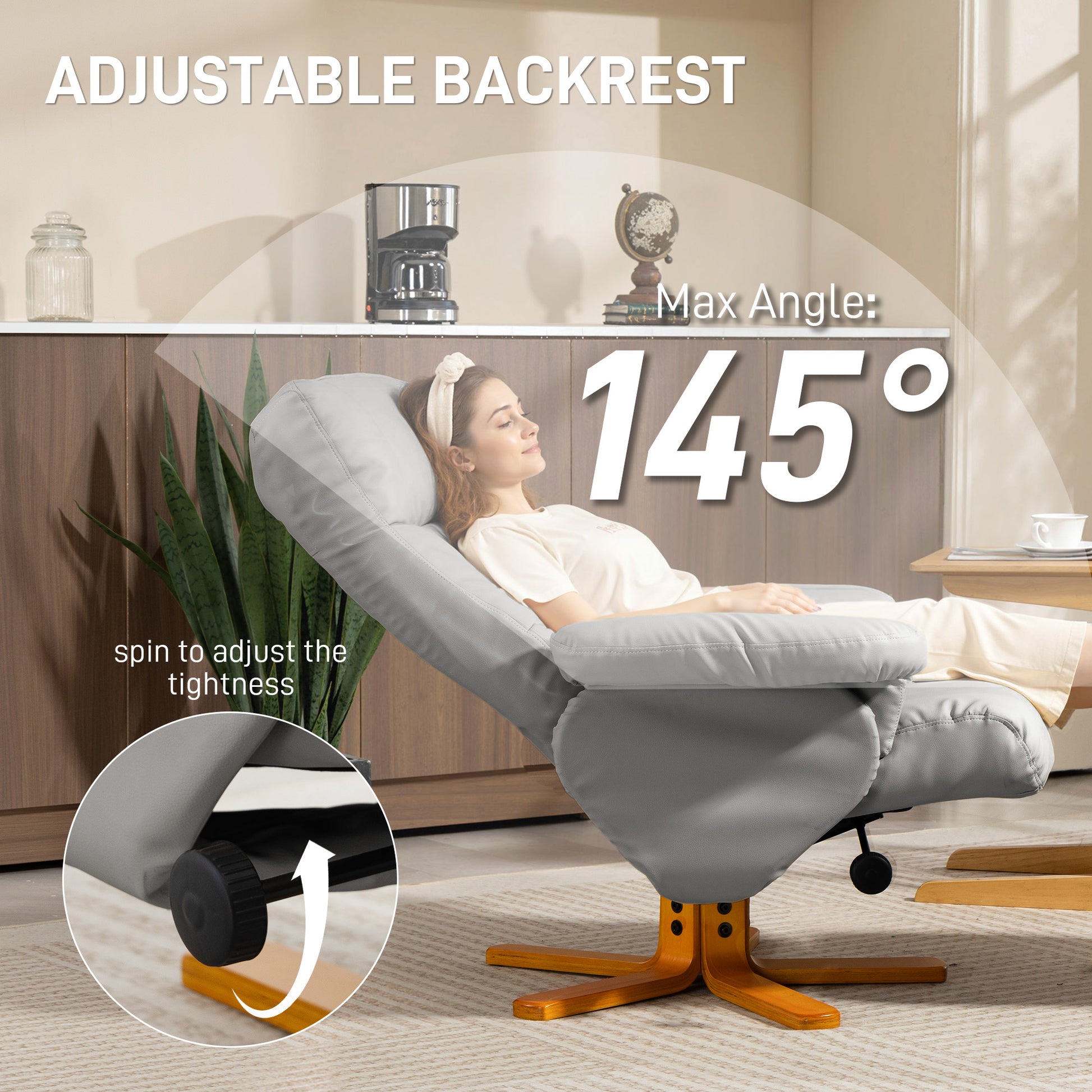 HOMCOM PU Leather Swivel Recliner Chair with Footstool, Wooden Base and Storage for Living Room, Light Grey