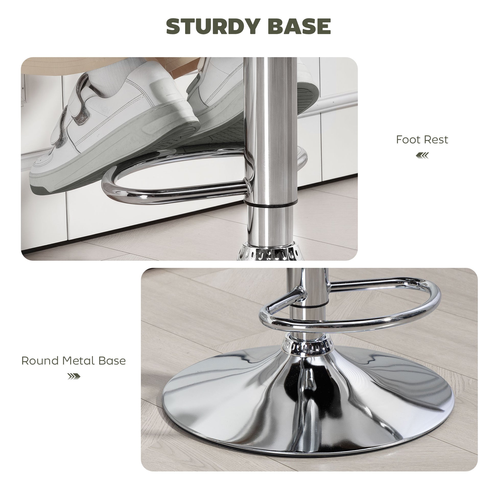- Supportive metal base with handy footrest. Foot pad to gently protect floor from marks